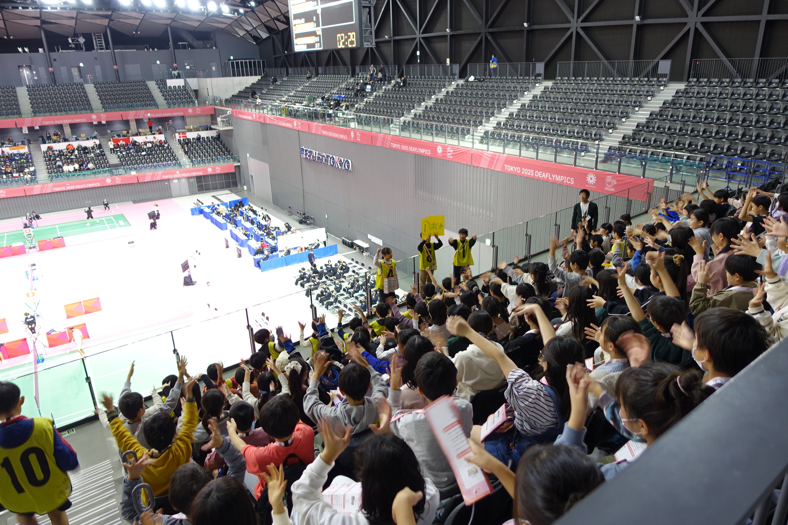 4年生は京王アリーナTOKYOにデフリンピックの観戦に行きました。聴覚障害者に声での応援は伝わりにくいので、今回のデフリンピックでは、当事者の方たちが考えた「サインエール」を覚え、各クラス3名のリーダーが中心となって応援をしました。バドミントンのシングルスの試合を観戦し、1セット相手のインドに取られ、2セット目に日本が1セット取り、いよいよ3セット目!というところで、予定されていた観戦時間が終了になり帰りましたが、4年生の応援のサインエールと掛け声は選手にきっと届いているはずです。