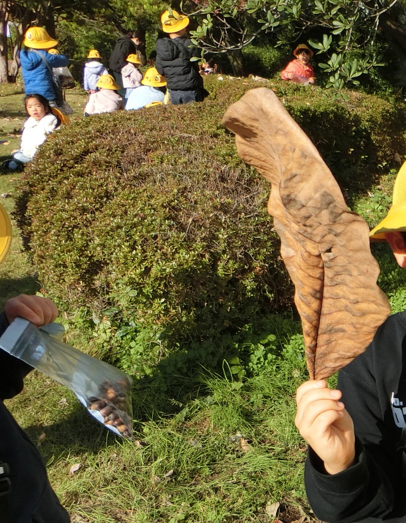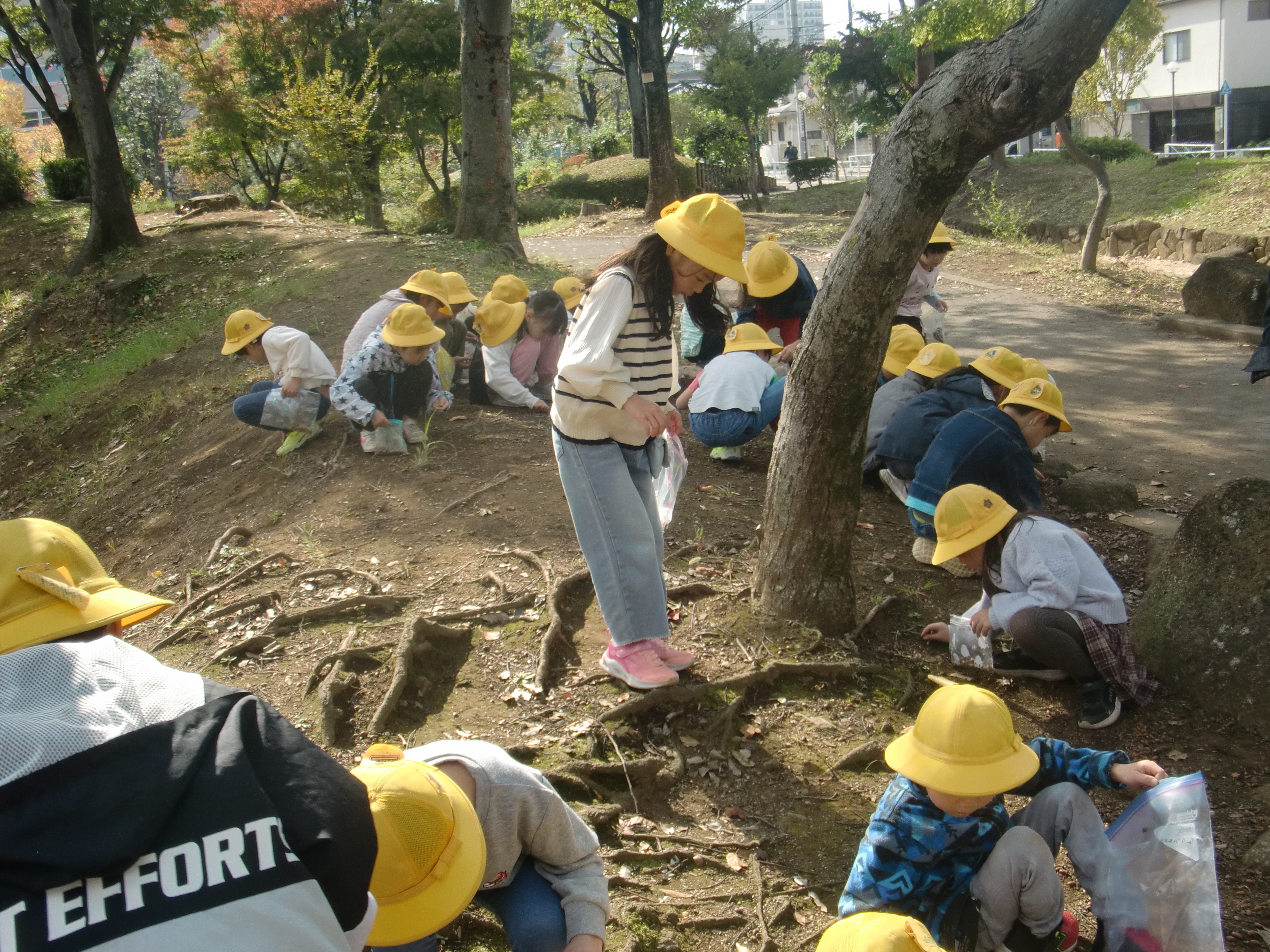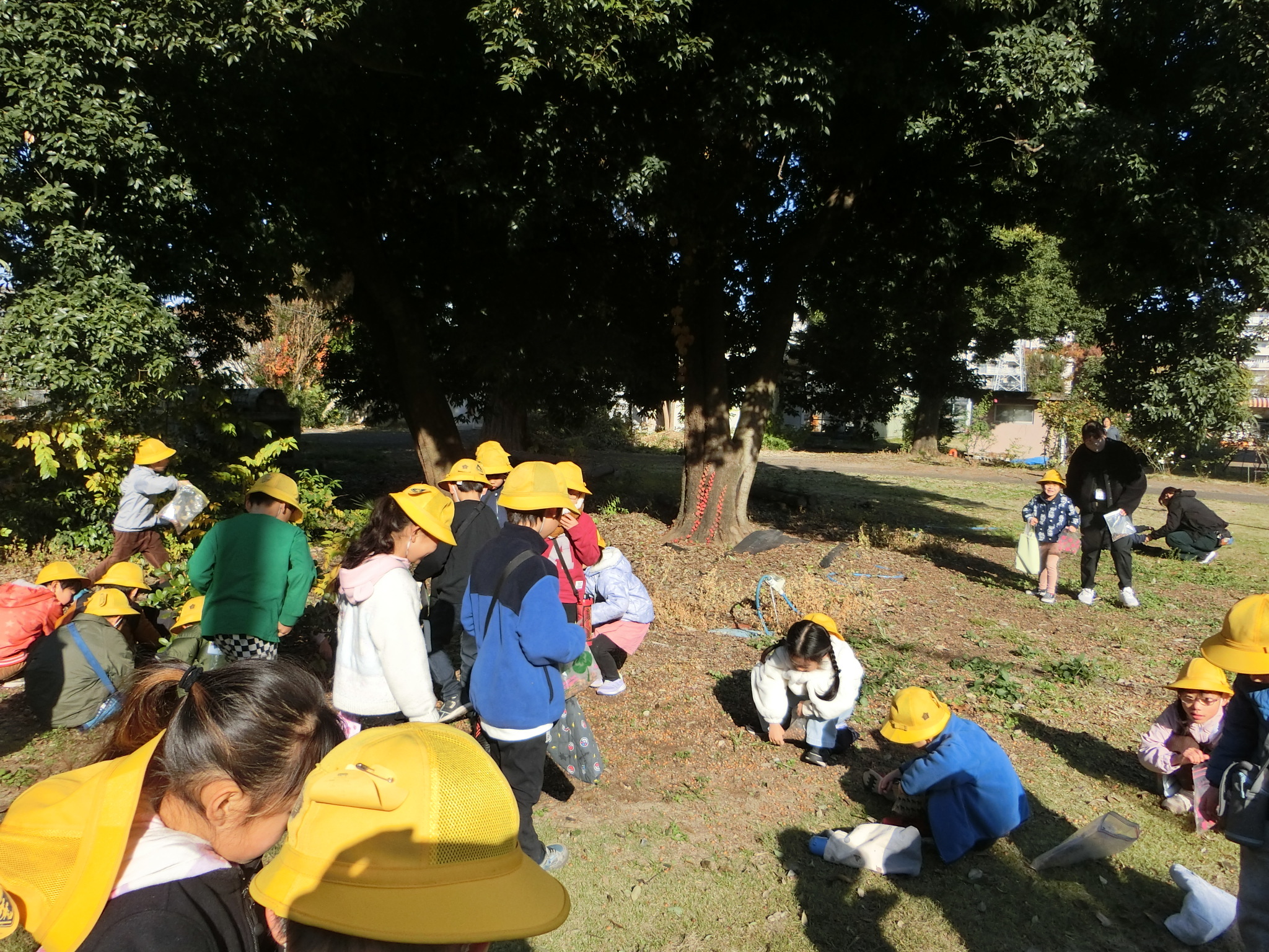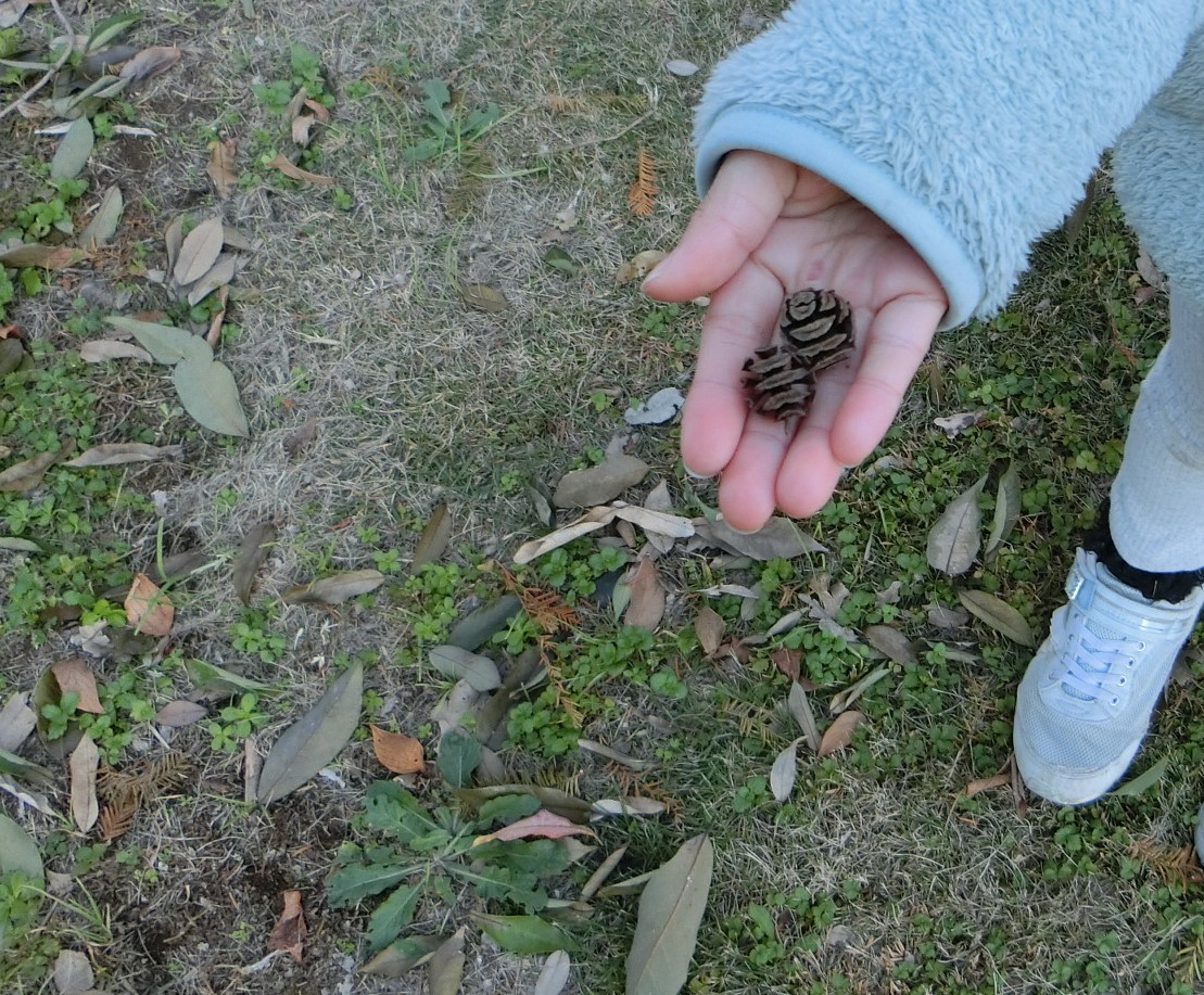 1年生は都立農業高校へどんぐり拾いへ行きました。コナラやシラカシなど様々な木があったため、丸いどんぐり、細長いどんぐり、小さいどんぐりなど色々な形のどんぐりを拾うことができました。また、小学校にはない、まつぼっくりや、大きな落ち葉なども見たり拾ったりすることができました。拾ったどんぐりを使って、おもちゃを作る予定です。