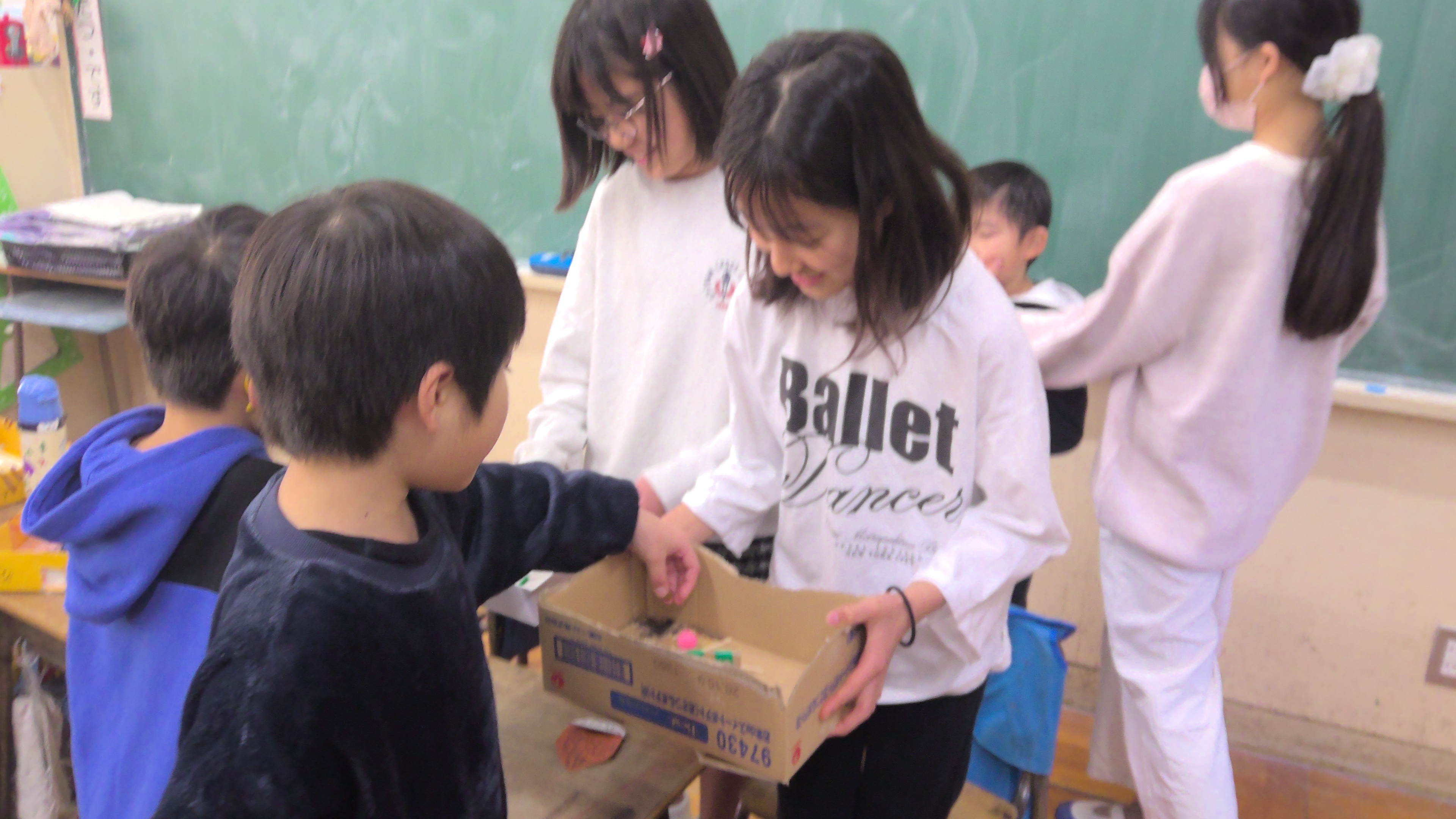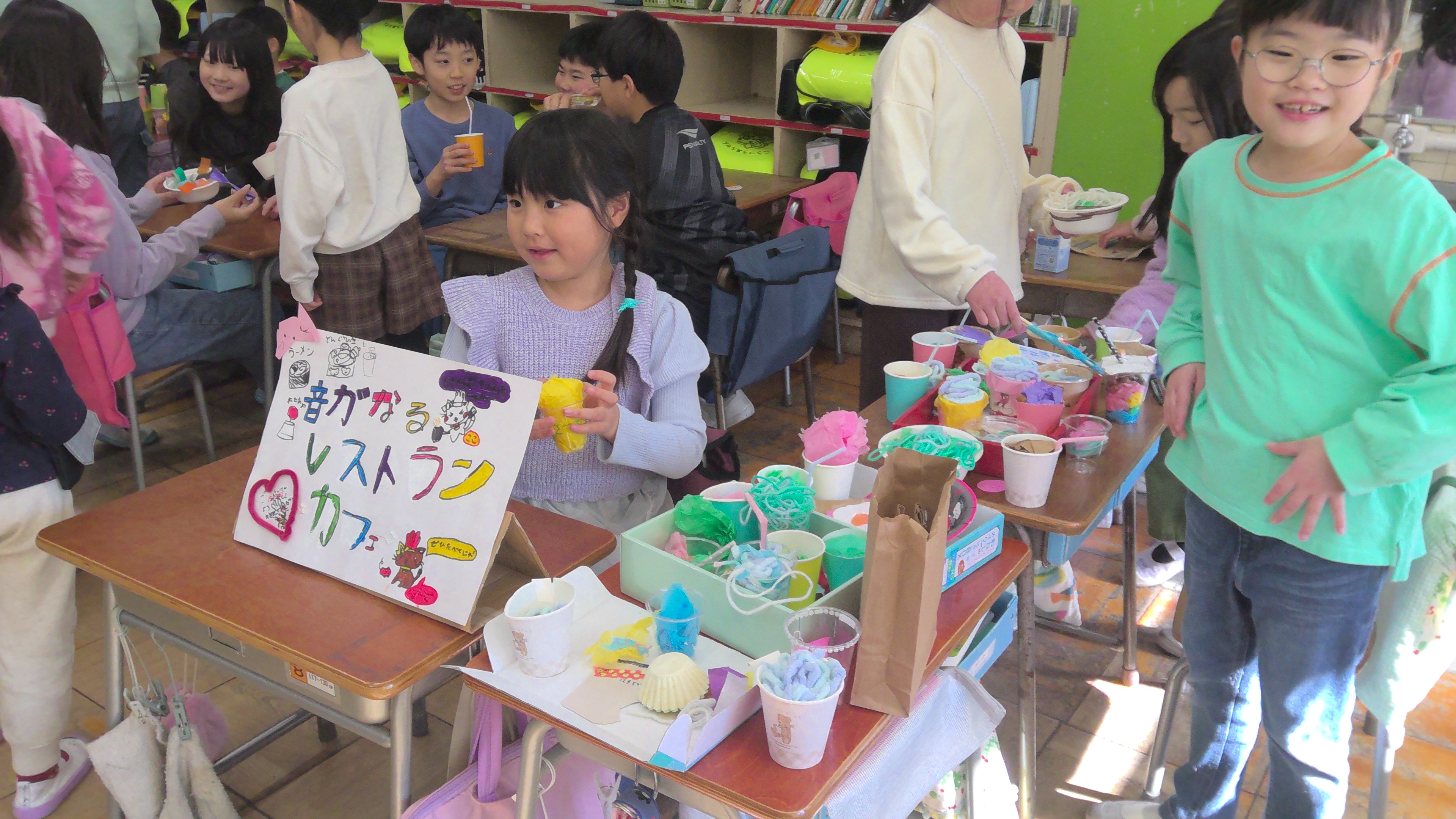 秋に拾ったドングリを使って、1年生がさまざまなお店を準備しました。お客様として6年生をご招待。とっても楽しい時間になりました。