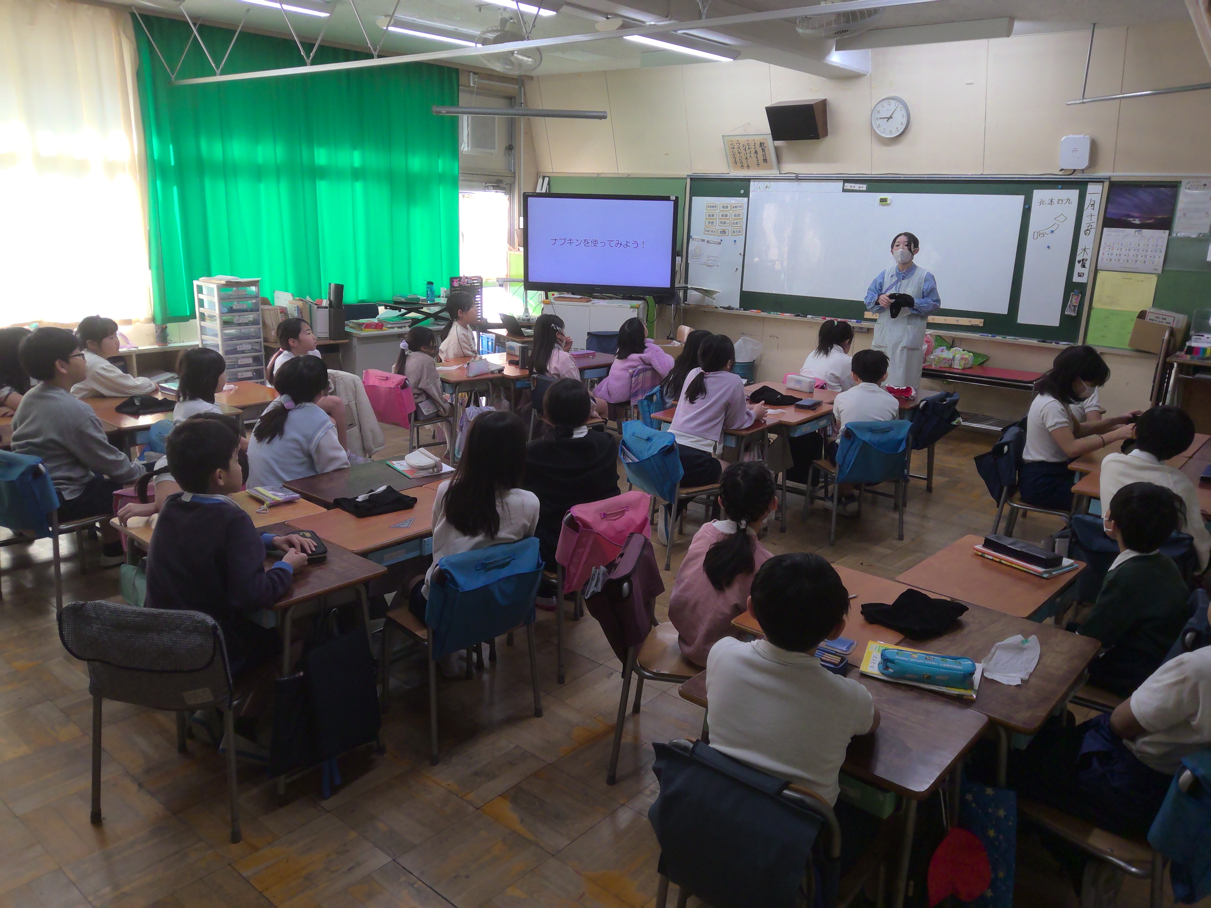 4年生の3学期の身体測定に合わせて、2学期に保健の授業で学習した「育ちゆく体と私」について、養護教諭の指導のもと、体験学習をしました。発達・発育には個人差があることや、男性・女性の体の仕組みなどを確認した後、生理用ナプキンをショーツに取り付ける体験を行いました。心も体も次第に大人に近づいていく4年生が、しっかりと知識を付け、安心して成長できるように取り組んでいます。