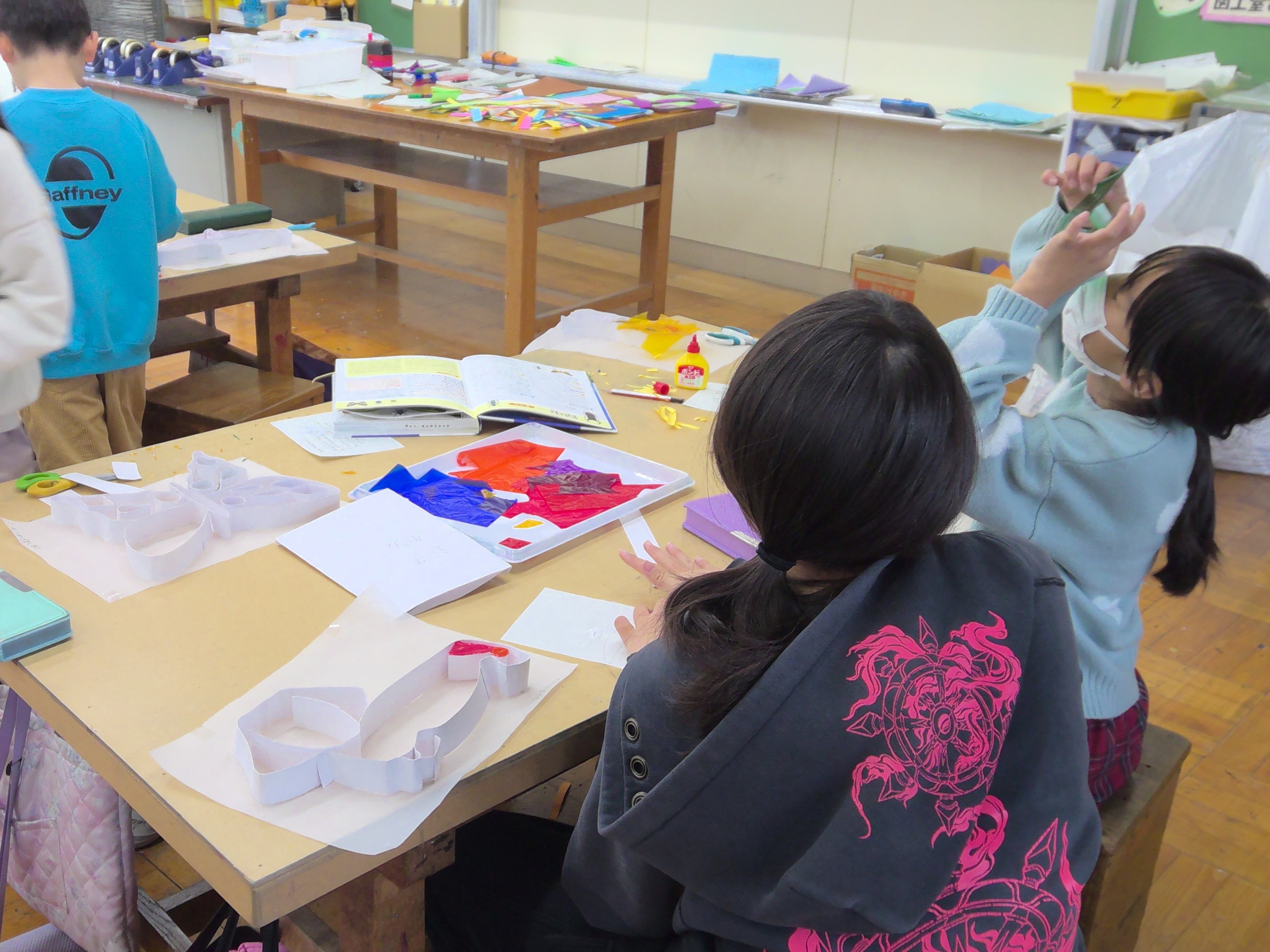 3年生の図工では、カラーセロハンを使った、ステンドグラスのような作品を作っています。蛍光灯にかざして、光の透ける様子を確認したり、学習した知識や技術を応用したりして、児童一人一人の個性が溢れる作品が完成しています。