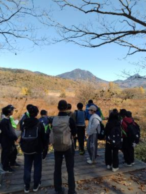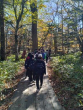 そこには、これからハイキングでお世話になるガイドさんたちが待っていました。「よろしくお願いします。」と気持ちよく挨拶して、戦場ヶ原のグループ行動がスタートしました。湯滝は水量も多く、真っ白なしぶきを上げていました。「滝の水にふれてみようか。」とガイドさんに言われ、手を浸すと 「冷たい!」と手をひっこめました。滝から離れ、しばらくは木漏れ日の中を歩きました。「甘い匂いの落ち葉を探そう」、「白樺は陽の当たる所に育つよ。」と、所々で立ち止っては、たくさんのことを教えてくれました。カラマツの紅葉が黄金色に輝く木道を、けもの道を見付けたり、シカに食べられた樹木を観察したりしながら、のんびりと歩きました。