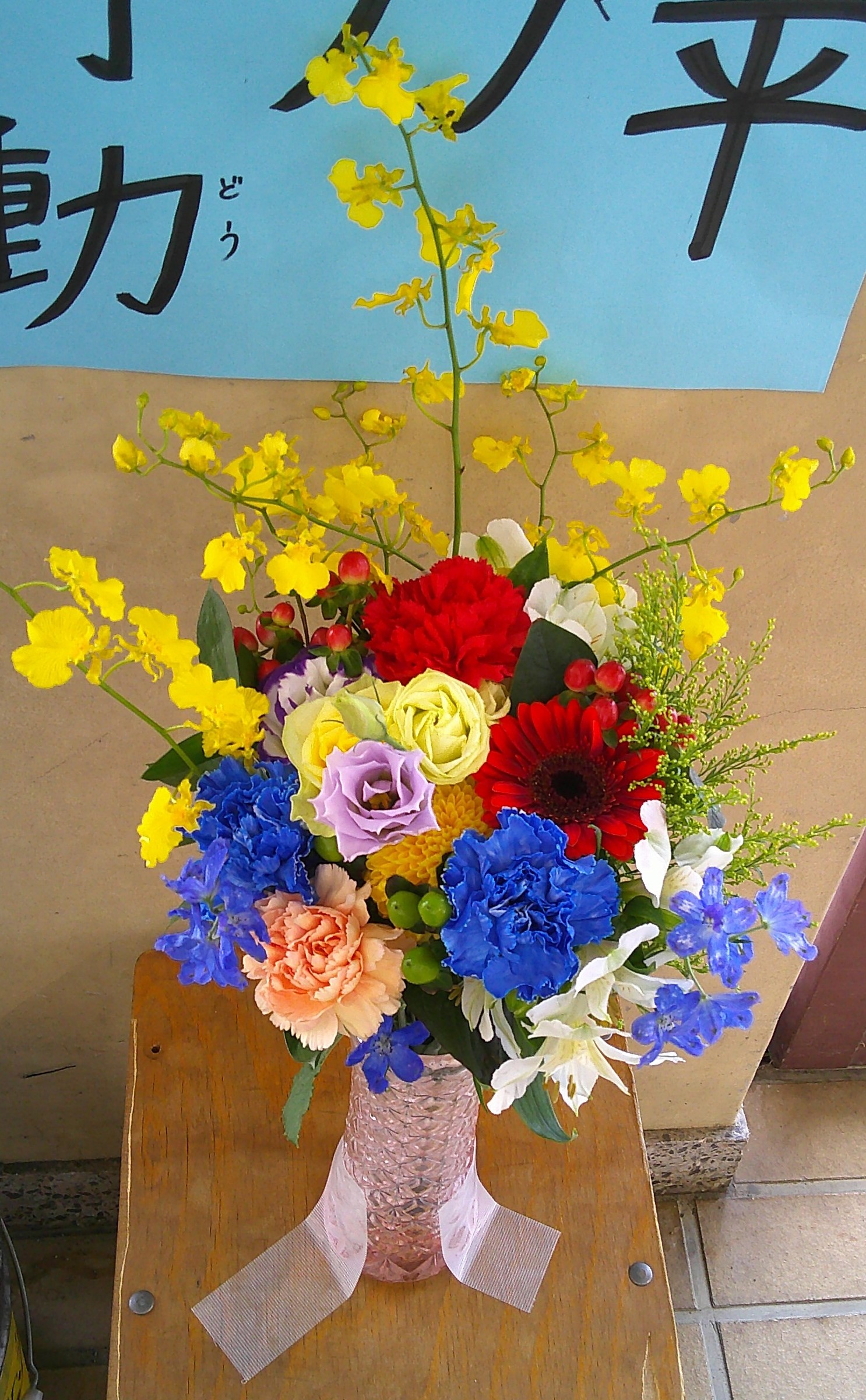 最後に、これを見てください。きれいなお花ですね。6年生のお友達の、おうちがお花屋さんで、4団の応援になるようにと、色を選んでもってきてくれました。嬉しいですね。五小の運動会が成功しますようにと、願いを込めて玄関に飾ります。心が安らぐ、きれいなお花をゆっくり見てください。