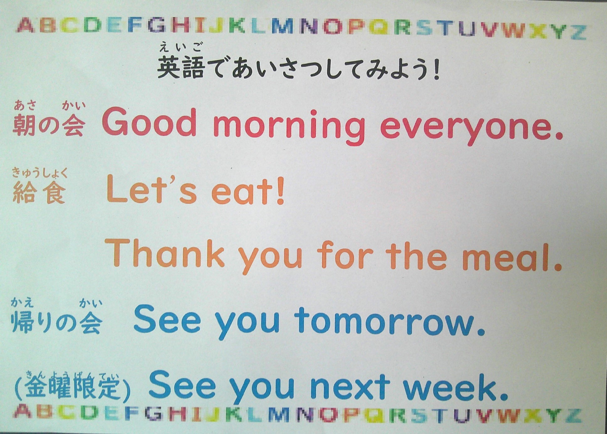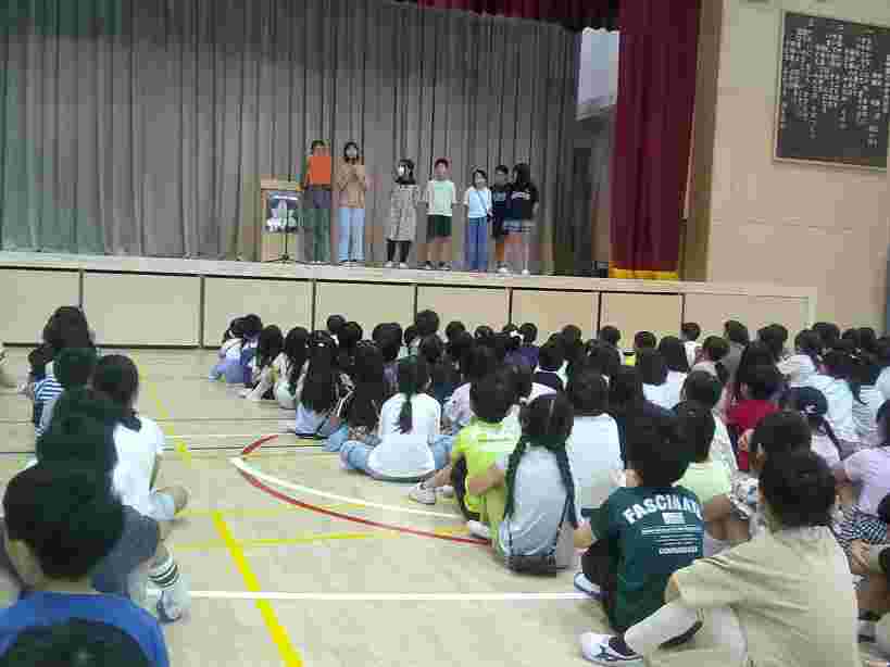 今日からイングリッシュウィークが始まりました。学校生活の様々な場面で、子供たちが英語に親しむ活動があります。全校朝会では代表児童が英語でイングリッシュウィークの紹介をしました。