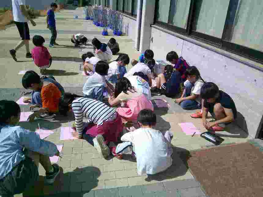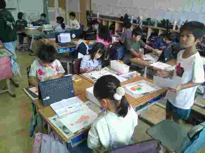5年生は総合的な学習で、クロームブックを活用し「わくわく自然教室」のまとめをしています。1年生の図工の学習「ぺったんコロコロ」は、教室を広く使って、色が重なったときの変化やいろいろな材料を組み合わせて模様を作りました。3年生は、理科で太陽の観察や、影のでき方を学習しました。