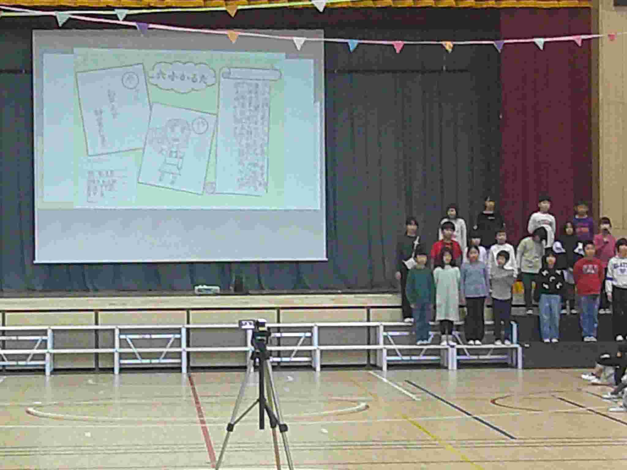 午後から創立70周年記念児童集会がありました。初めに全校児童で「ハッピーラッキーバースデー」を合唱し、会場全体で今日はみんなで六小のお祝いをしようという温かい雰囲気が広がりました。そして、各学年からは六小や地域の自慢・歴史などにまつわる出し物の発表がありました。最後は、全校児童で手話を交えながら校歌の合唱をしました。いよいよ来週は、創立70周年記念式典です。