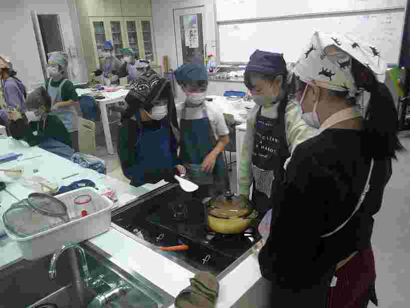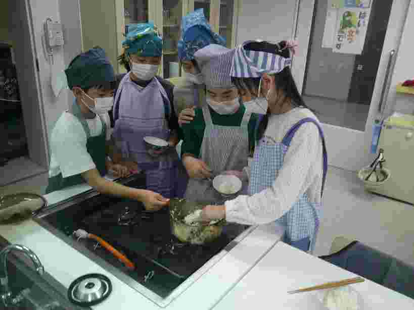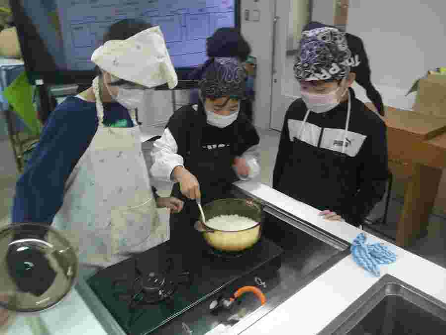 5年生は家庭科の調理実習で、ご飯を炊きました。炊飯器を使うのではなく、ガスコンロと透明な鍋を使い、火加減や蒸す時間を調整しながら行いました。家庭科室内は、炊き立てのご飯のおいしそうなにおいが部屋いっぱいに広がっていました。お米のおいしさを改めて実感できる学びとなりました。