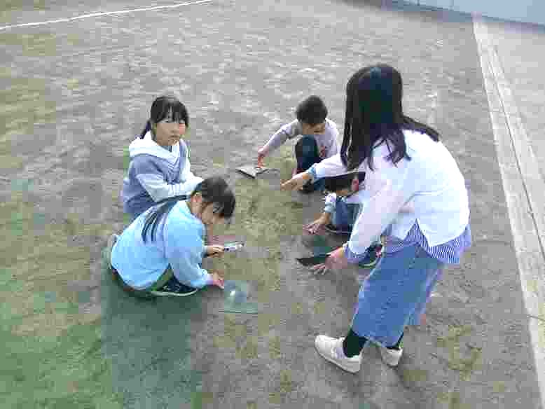 2年生の図工は、絵の具を使い、国語の物語文で学習した「スイミー」が見た「海の世界」を表現しています。3年生は、理科で太陽とかげの学習をしています。今日は校庭に出て、虫眼鏡を使って太陽の光を集める実験をしました。
