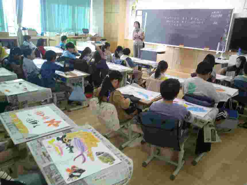 5年生の家庭科はミシンを使う学習に入りました。初めてミシンに触れる子供たちが多く、興味津々の様子でミシンの仕組みや操作の方法を学んでいました。3年生の図工は、絵の具と筆を工夫しながら使い、楽しい動きを作りだす作品づくりをしました。