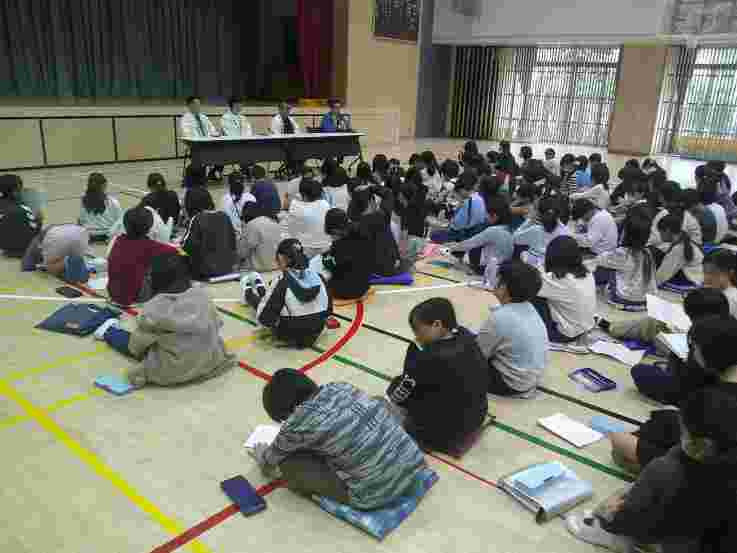 全校朝会で、長い間見守りを担当してくださった方に、児童から感謝の気持ちを伝えました。(14日・月)