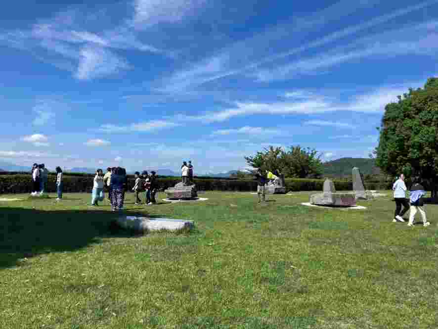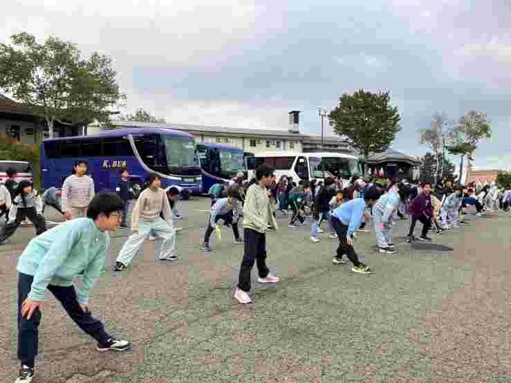 おはようございます。6時30分ホテルの前の広場で朝会をしました。少し肌寒く曇っていますが、晴れ間も見えます。体操をして、目覚めのスイッチを入れました。7時30分から朝食です。