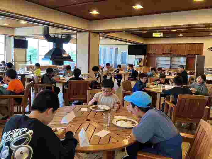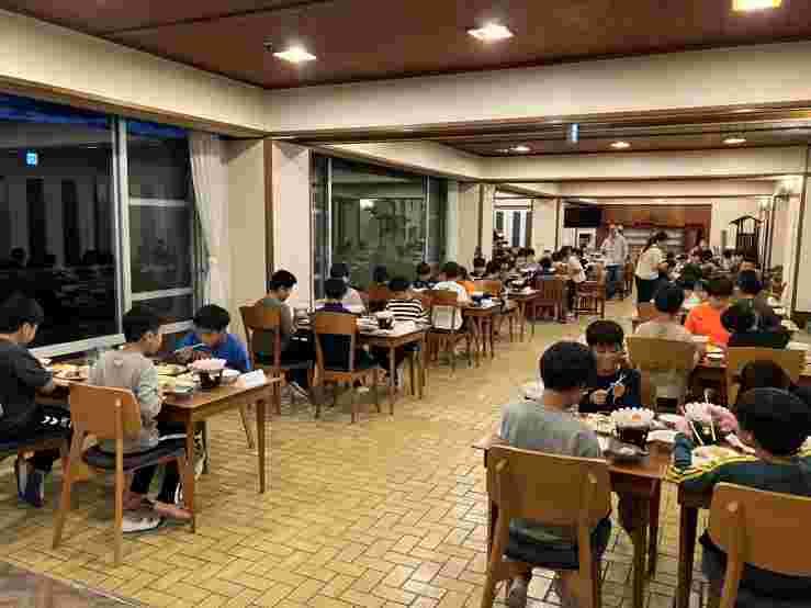 待ちに待った夕食です。食事係のあいさつで、おいしくいただきます。みんなおなかぺこぺこです。