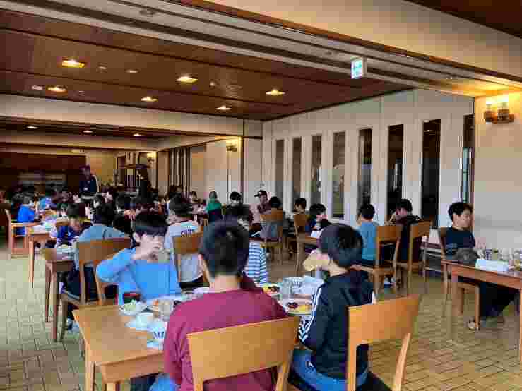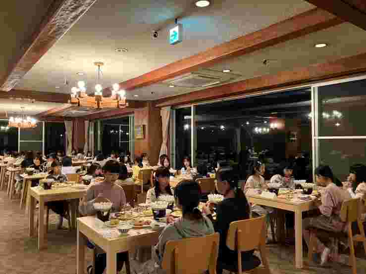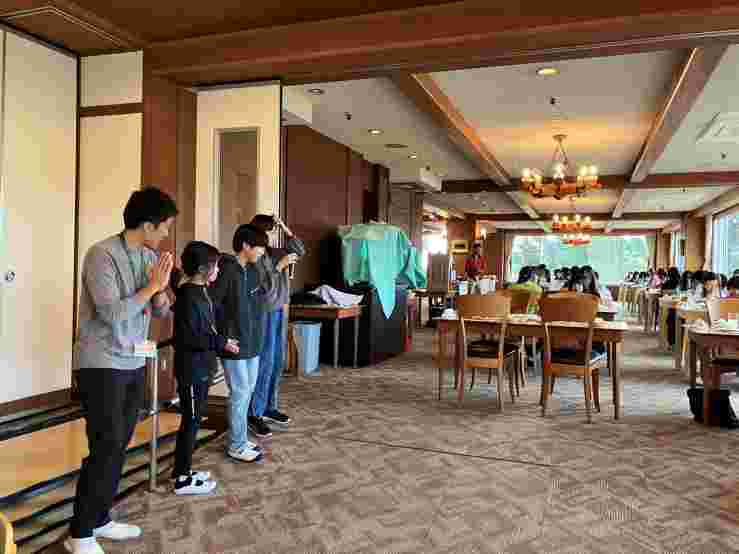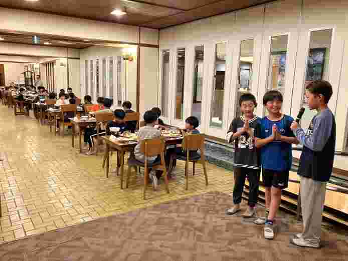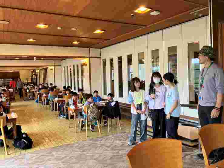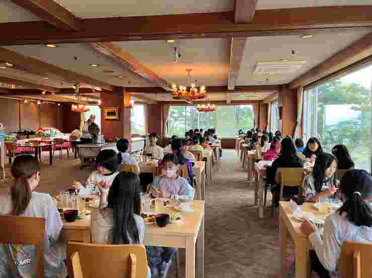 希望湖トレッキングとジップラインを楽しみました。高原の空気がとてもおいしく、トレッキングでは、植物や虫をたくさん見つけました。お世話になる斑尾高原ホテルの方にご挨拶をして入館式を行いました。避難訓練を済ませて、入浴をしました。お風呂から上がった子供たちは、気持ちよかったと感想を話してくれました。みんな元気です。このあと、18時10分から夕食です。