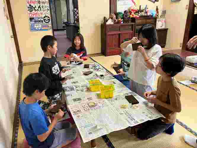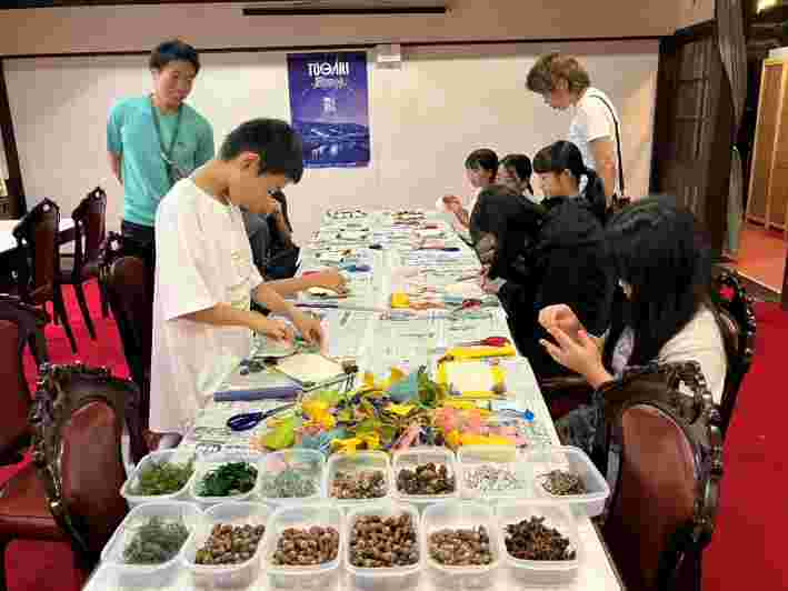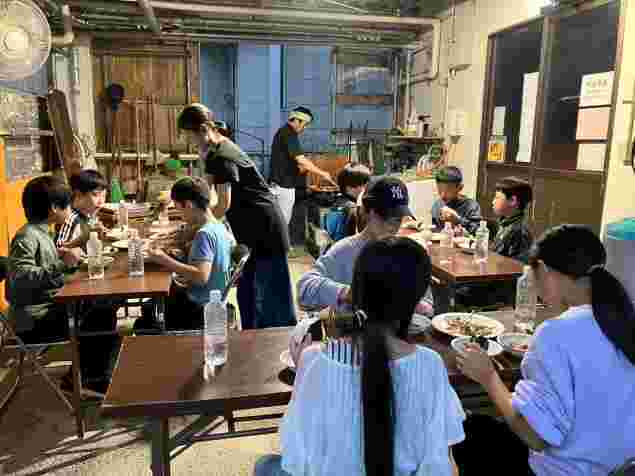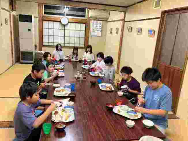 民宿でそれぞれ夕食の時間です。自分で作ったマイ箸で美味しくいただいています。