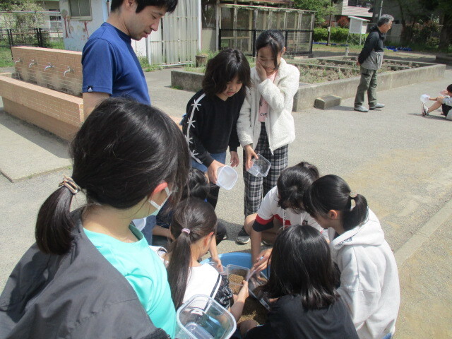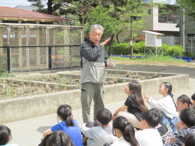今年も澤井さんにお越しいただき、稲栽培の指導を受けます。自分たちで持ち寄った透明のケースに植えて、発芽を待ちます。