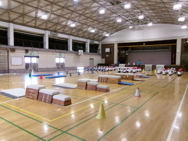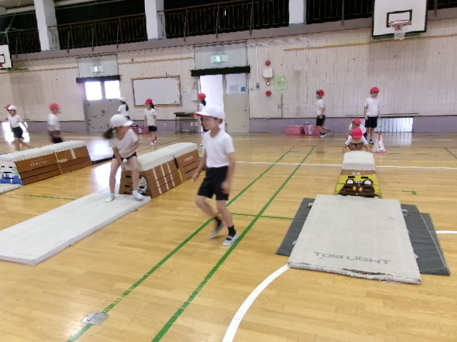 体育の時間に、跳び箱ランドで跳び箱遊びを行いました。高さの違う跳び箱や長く並べた跳び箱の上を両手を使って前に進んだり、平均台を左右に体を振って跳んだり、肋木に一段ずつ足をかけて上がったりしました。子供たちは自分の好きな場所に行き、跳ぶ、手をつく、着地など様々な動きを楽しみながら取り組みました。