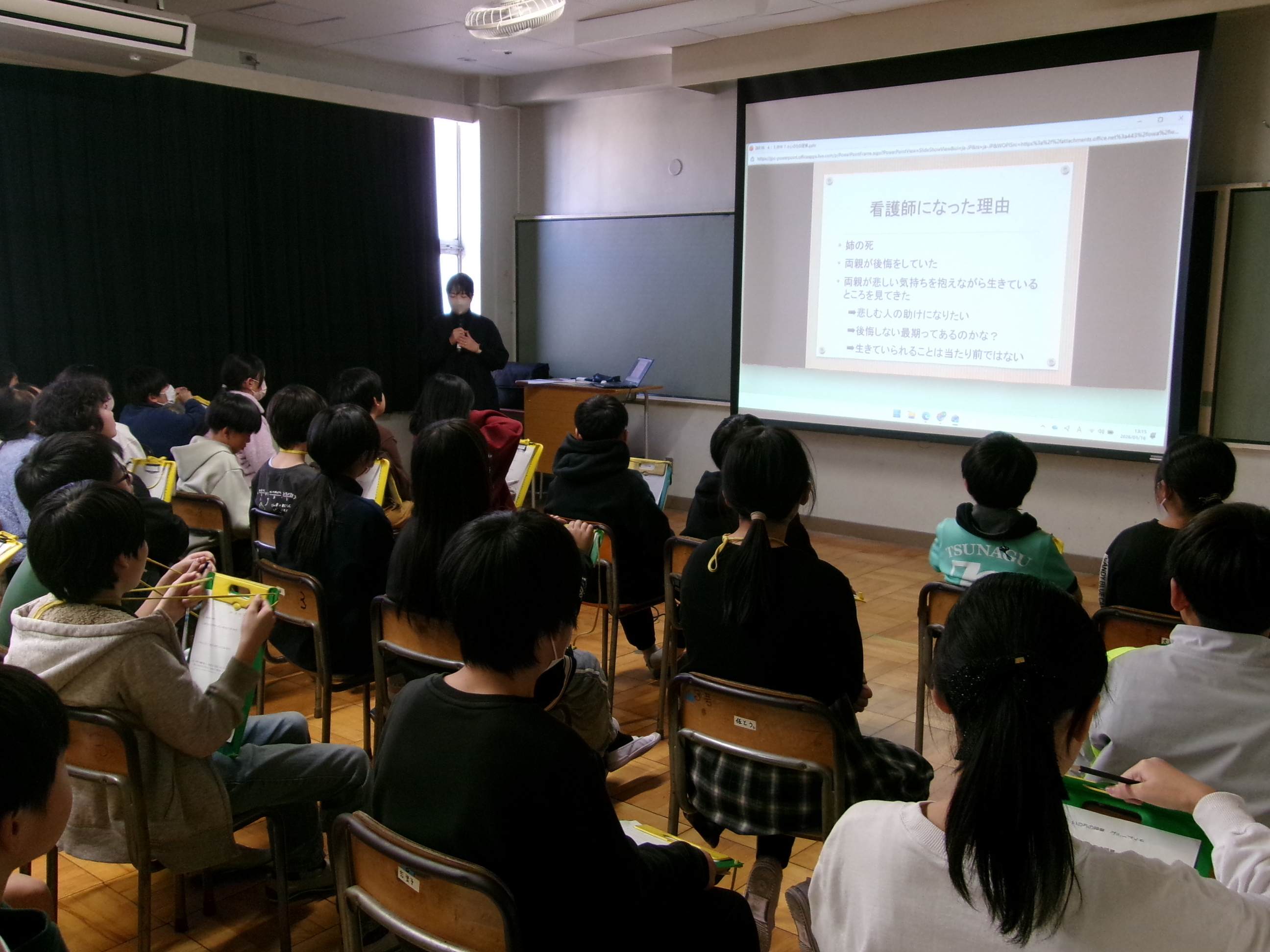 先日、認定看護師の方をお招きし、「いのちの授業」を行っていただきました。「象の背中」という話を見て、もし、身近な人が死んでしまったら…と「死」を考えることで、「生きる」とはどういうことなのかを考えました。子供たちにとって当たり前のように日常を送れている中で、「生きている」ということについて普段考える機会はなかなか無いと思います。授業の最後に、この授業を通して、「生きる」とはどういうことか、また、これからどのように生きていきたいかということを考えました。「生きるということが当たり前だと思っていたけれど、これからは、より毎日を大切に生きていきたい」「悔いのないように過ごしていきたい」「自分や友達や家族などの周りも大切にして生きていきたい」と意見をもっているお子さんがいました。今後も、かけがえのない命を大切に、一人一人毎日を大切にすごしていってほしいなと思います。