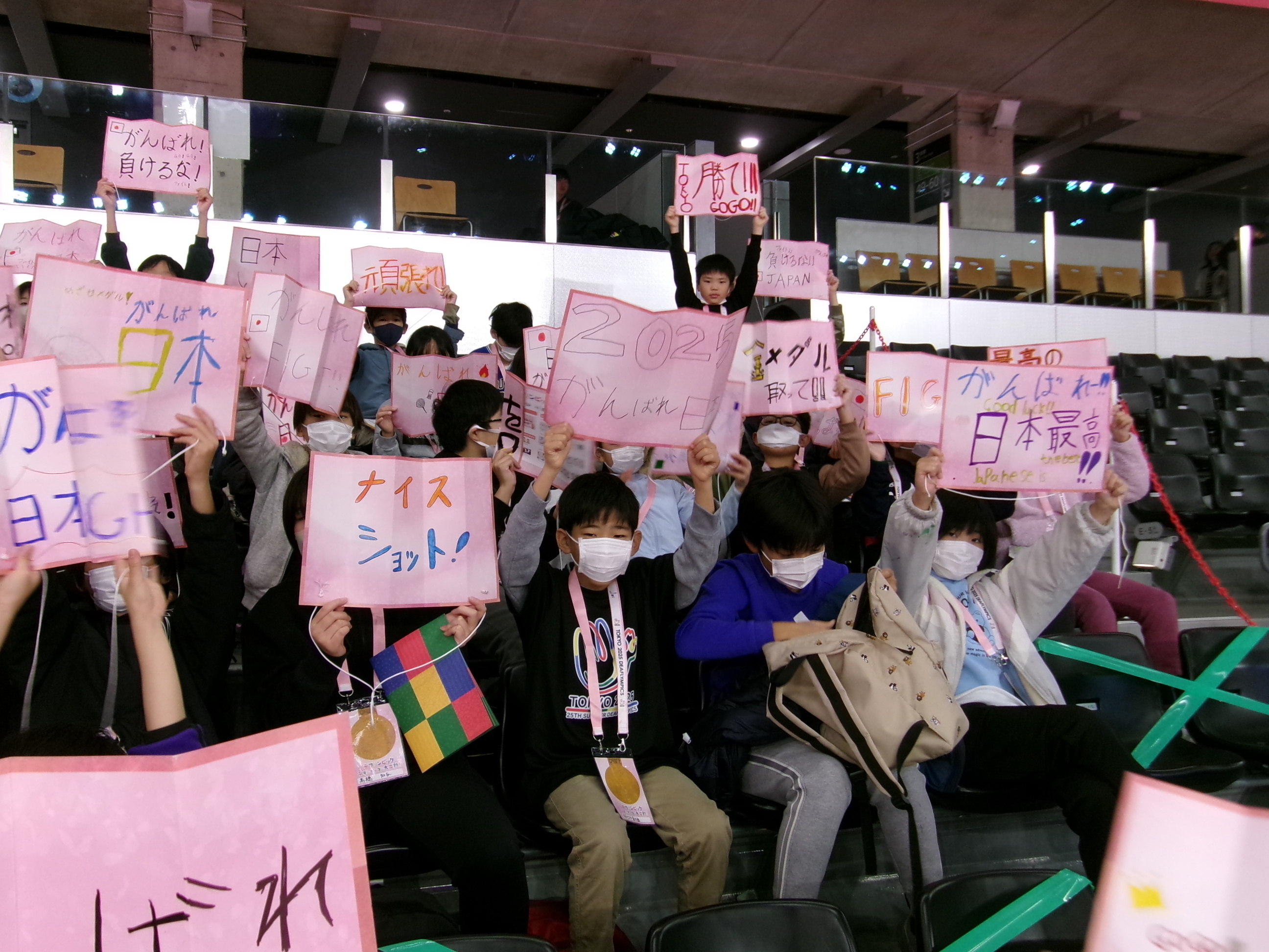 京王アリーナにデフリンピックのバドミントンの観戦に行きました。応援ボードを作り、選手たちにサインエールを送りながら観戦しました。選手と近い場所から観戦することができ、子供たちもその迫力に感動する姿がありました。あっという間の観戦時間で、「もう少し見たい!」と思うくらいでした。帰校後は、見て気付いたことや学んだことをグループごとに新聞を書きました。テレビではなく実際に観戦できたことがとてもよい経験になったことと思います。