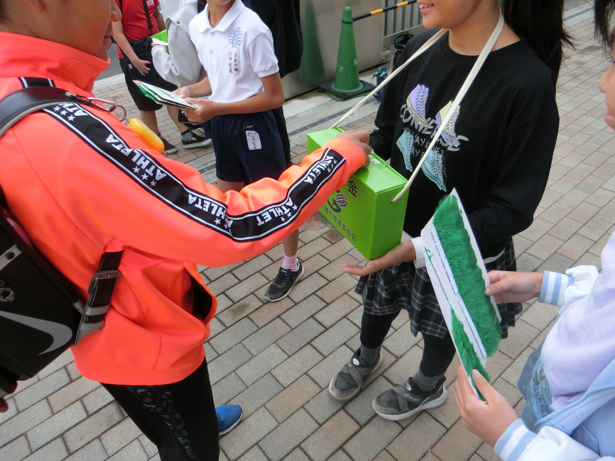 栽培委員会が緑の募金をしてくれました。ご協力いただいた皆様、ありがとうございました。このあと、委員会の子供たちが募金額を計算します。