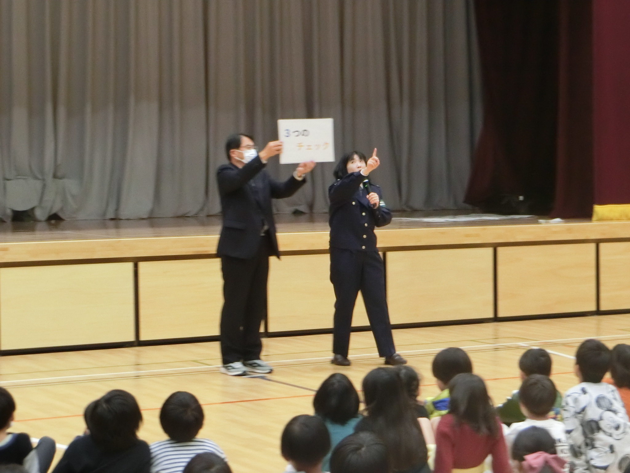警察の方が来て交通安全講話をしてくださいました。横断歩道を渡るときは、手をしっかり挙げて、体を大きく見せること、自転車に乗るときは必ずヘルメットをかぶって頭を守ることなどを改めて教えていただきました。児童の交通事故がないように願うばかりです。