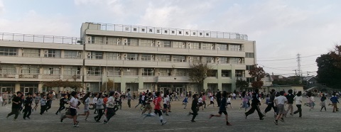 今日の体育朝会で全校児童が一斉走り!