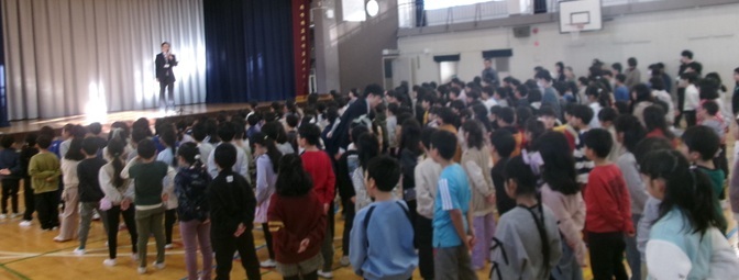 今日から3学期が始まり、全校児童が体育館に集まりました。