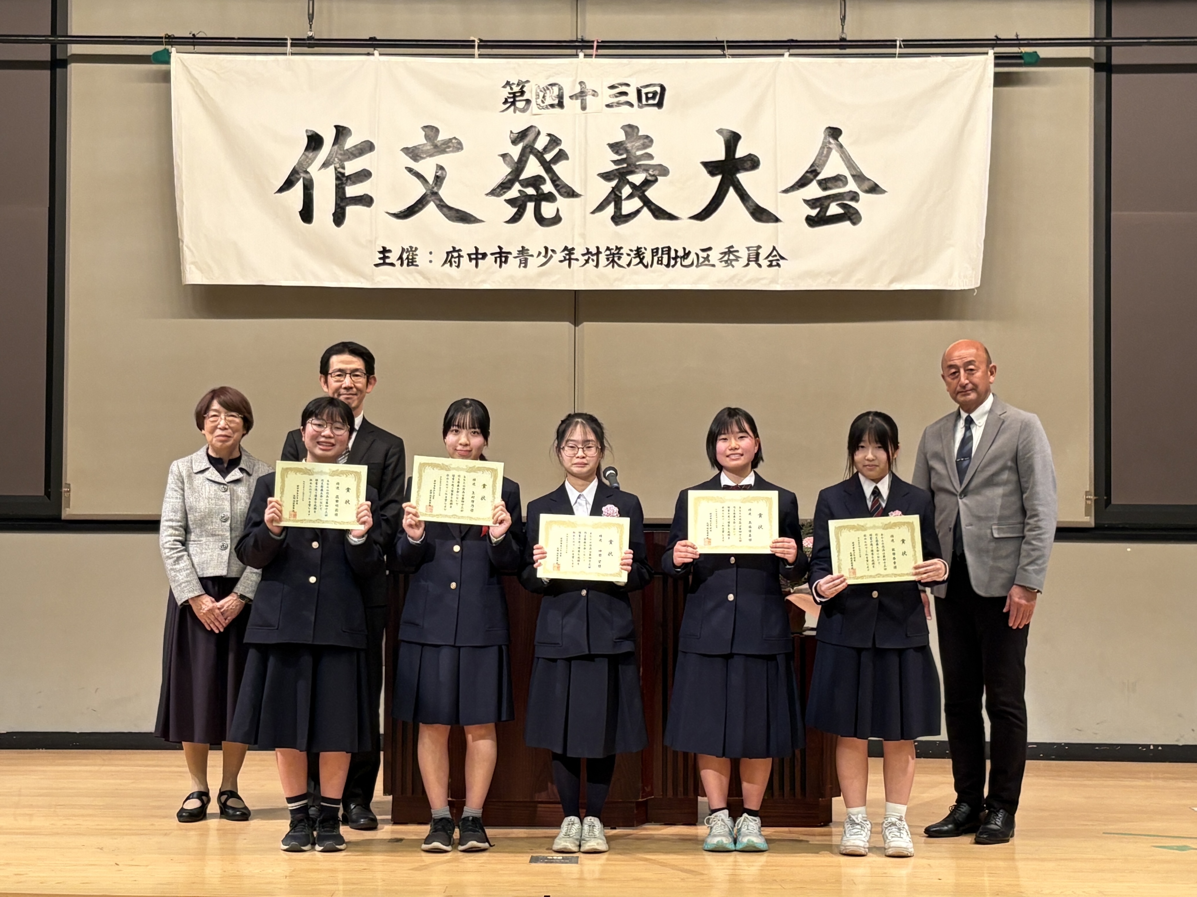 12月14日(土)、府中第二小学校にて、府中市青少対浅間地区委員会による「浅間作文発表大会」が開かれ、浅間中の生徒7名が表彰されました。今、自分が考えていることや大事にしていることなどについて、それぞれの視点で思いを込めながら、府中第二小、若松小の受賞児童たちとともに、臨席した浅間中の生徒たちも堂々と発表しました。表彰作品のタイトルは、以下の通りです。