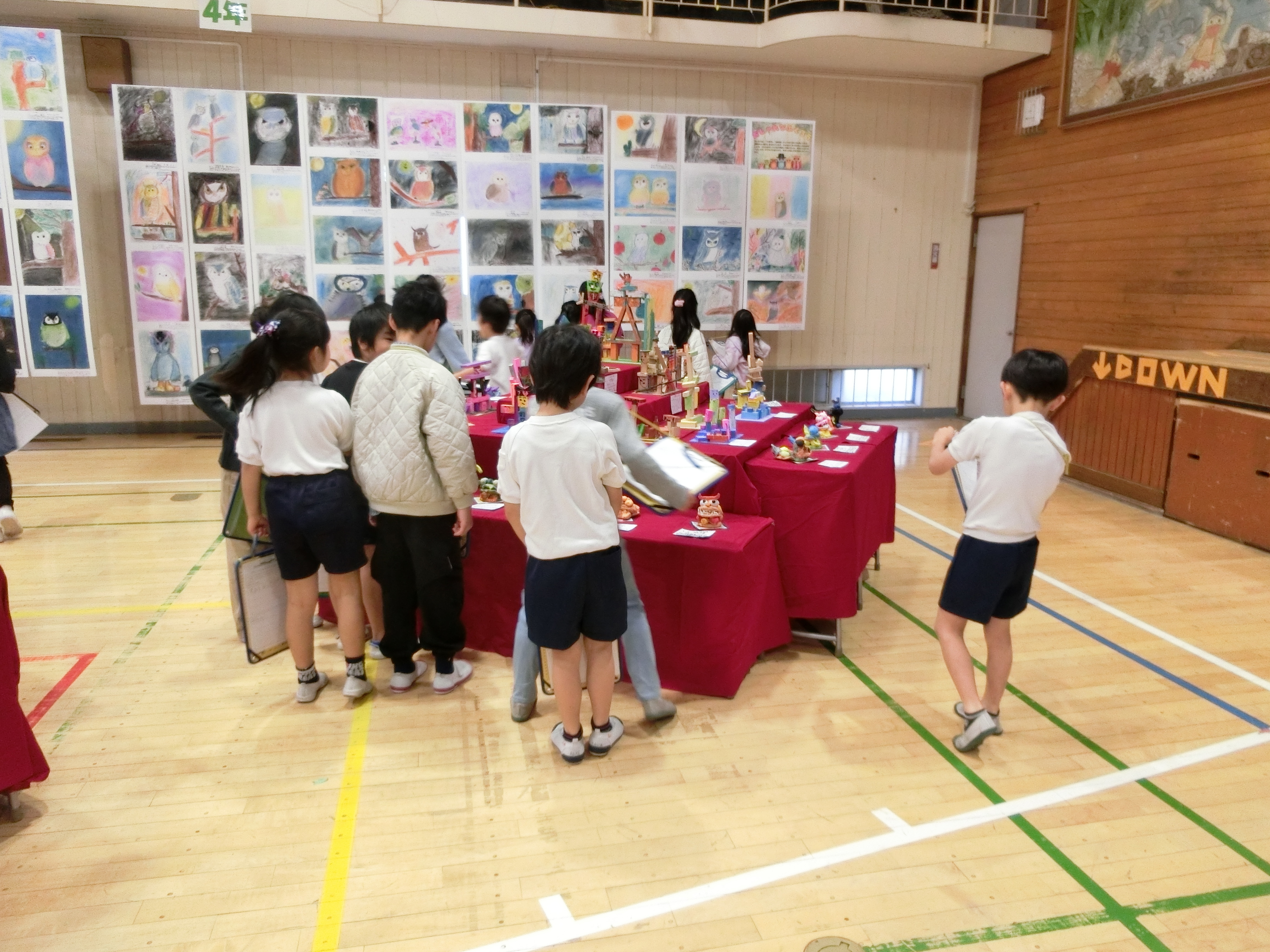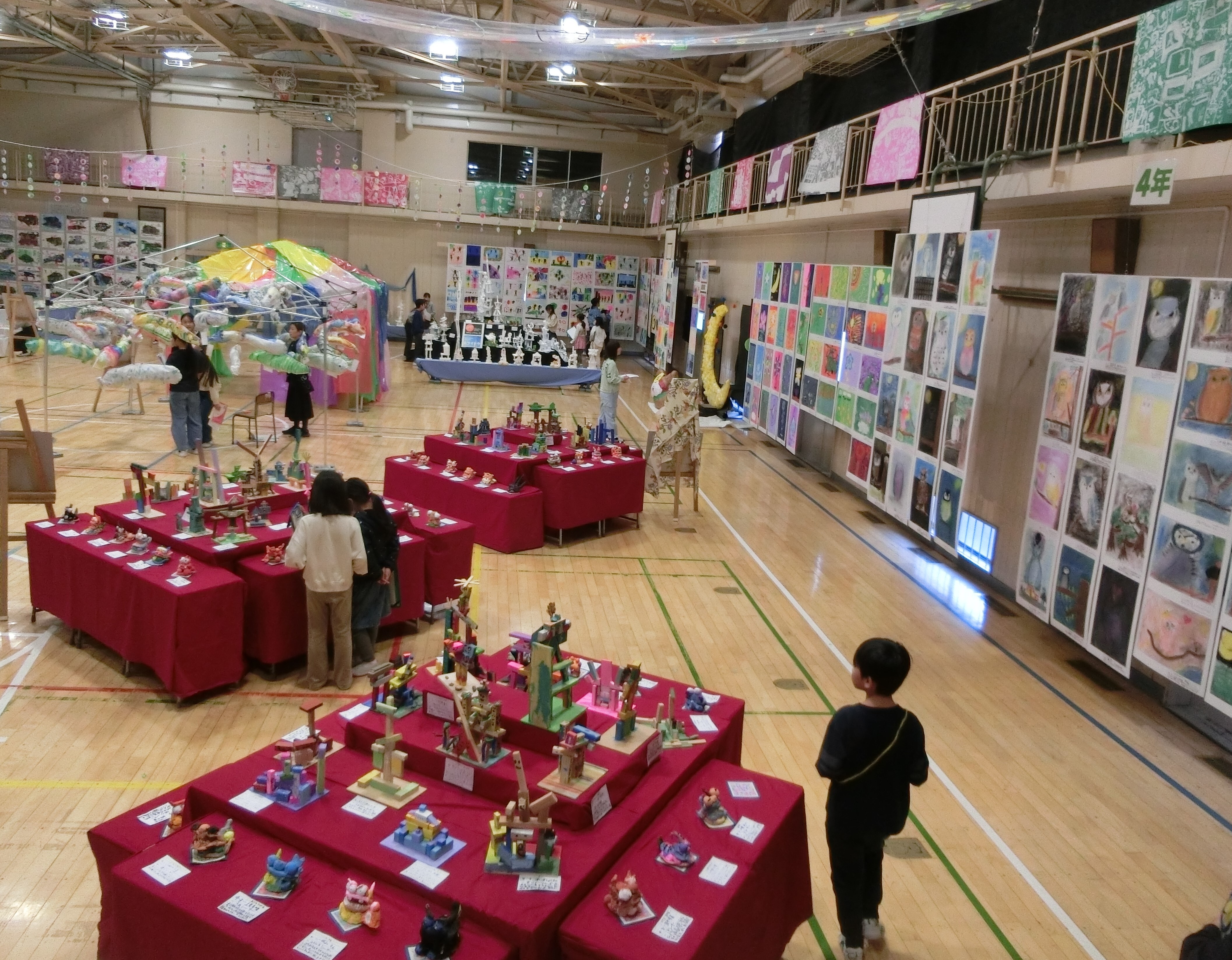 27日から始まった若松小学校の展覧会、子どもたちの力作が並んでいます。2年生の平面作品は「はさみのアート」「ワンダフルワールド」、立体作品は「ニジマス」「まどをあけたら」です。自分や友達の作品だけでなく1年生から6年生の作品をじっくり鑑賞しました。様々な作品に触れながら、たくさんの良さや工夫を見つけながら楽しむことができました。