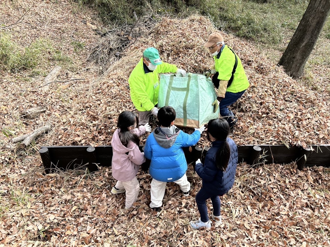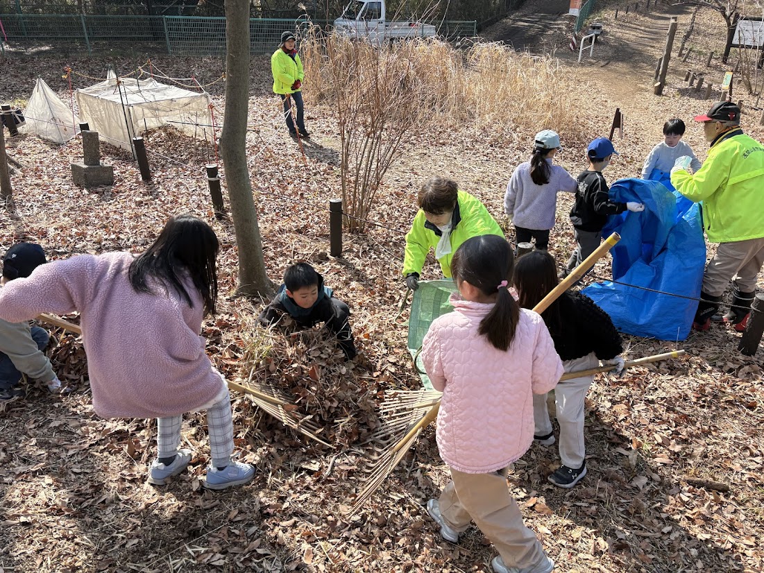 2月18日に浅間山へ行き、浅間山保護会の皆さんと一緒に落ち葉ひろいのボランティアを行いました。