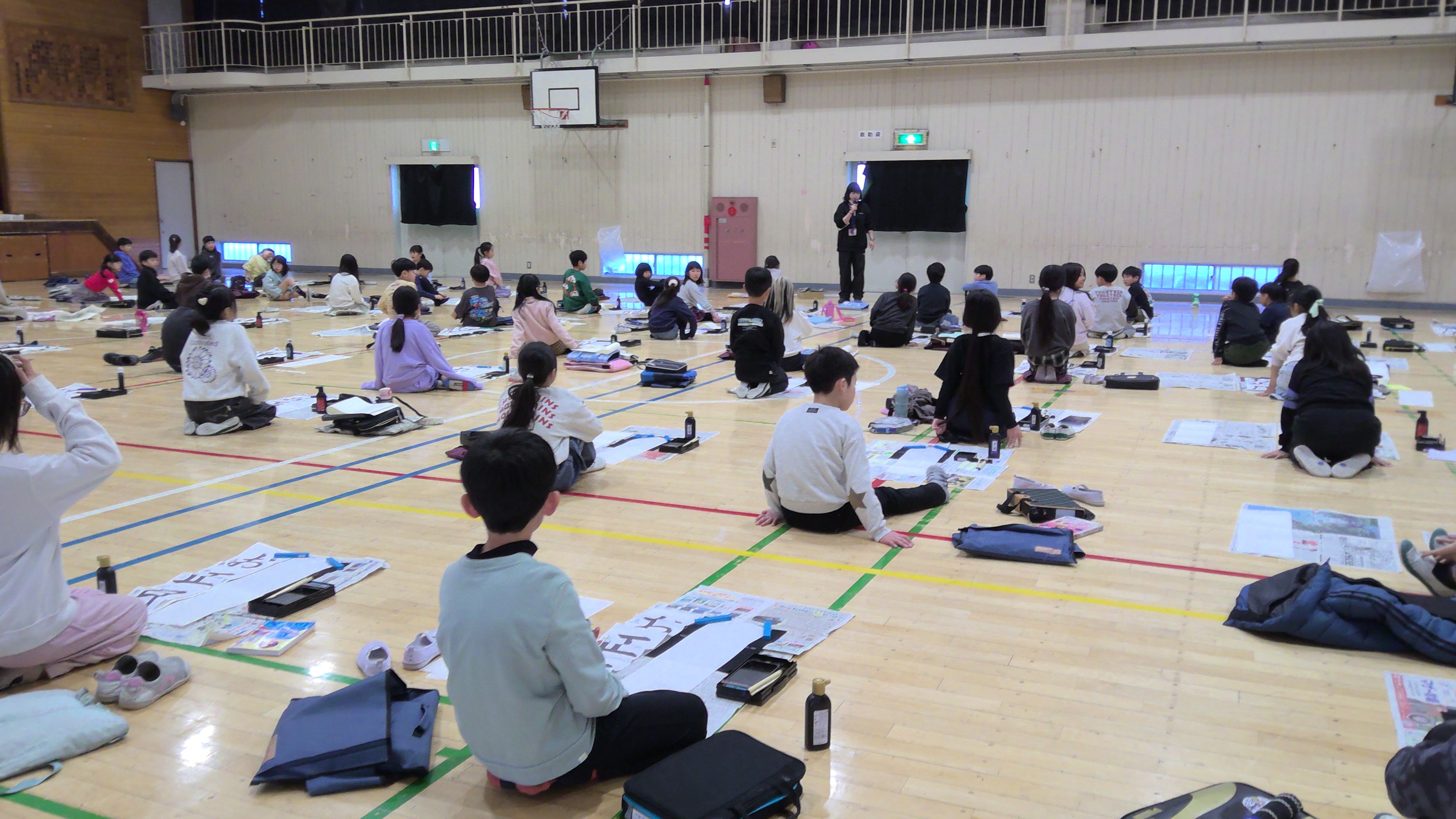 1月13日に3年生全体で体育室に集まり、書き初め大会を行いました。