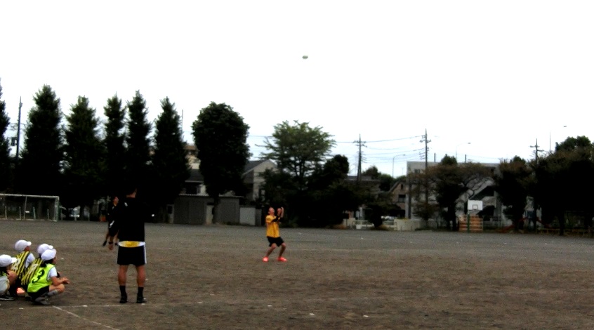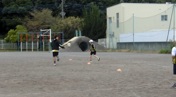 出前授業では、選手と一緒にラグビーボールを使って投げたり走ったりして