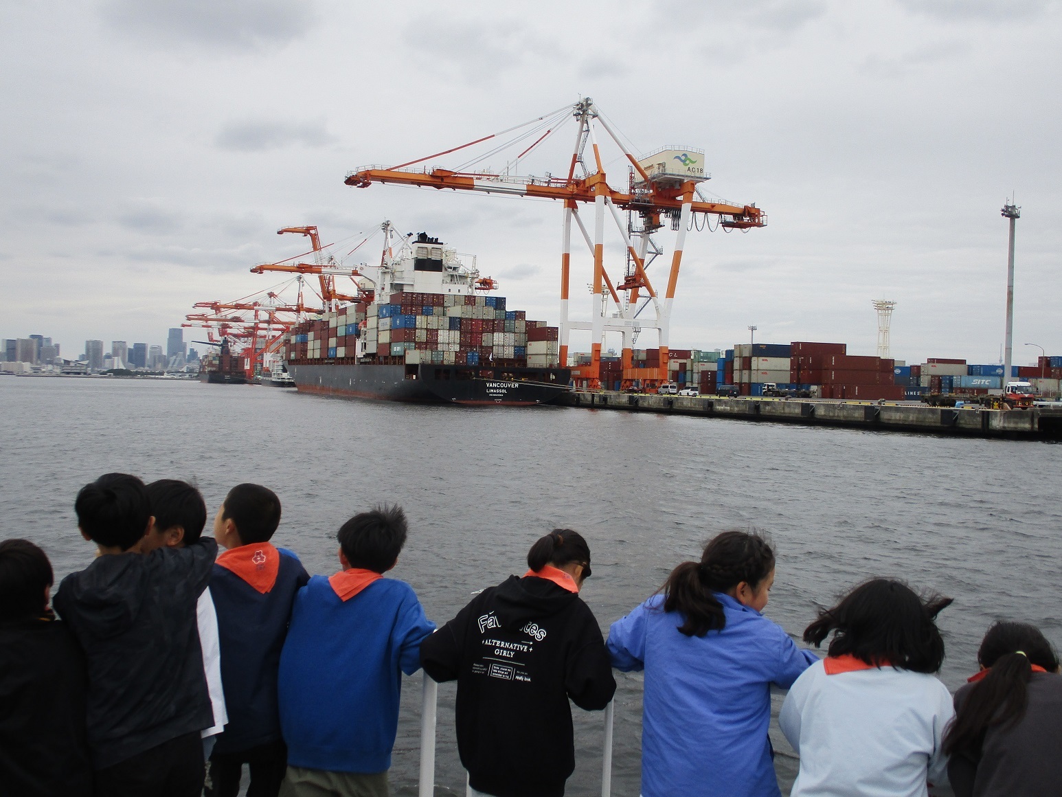 東京港では見学船に乗って成田空港から飛び立つ飛行機を見たり、海外を行き来する貨物船を見たりしました。