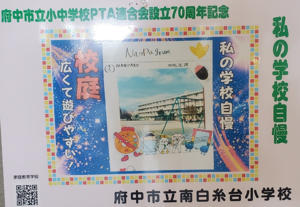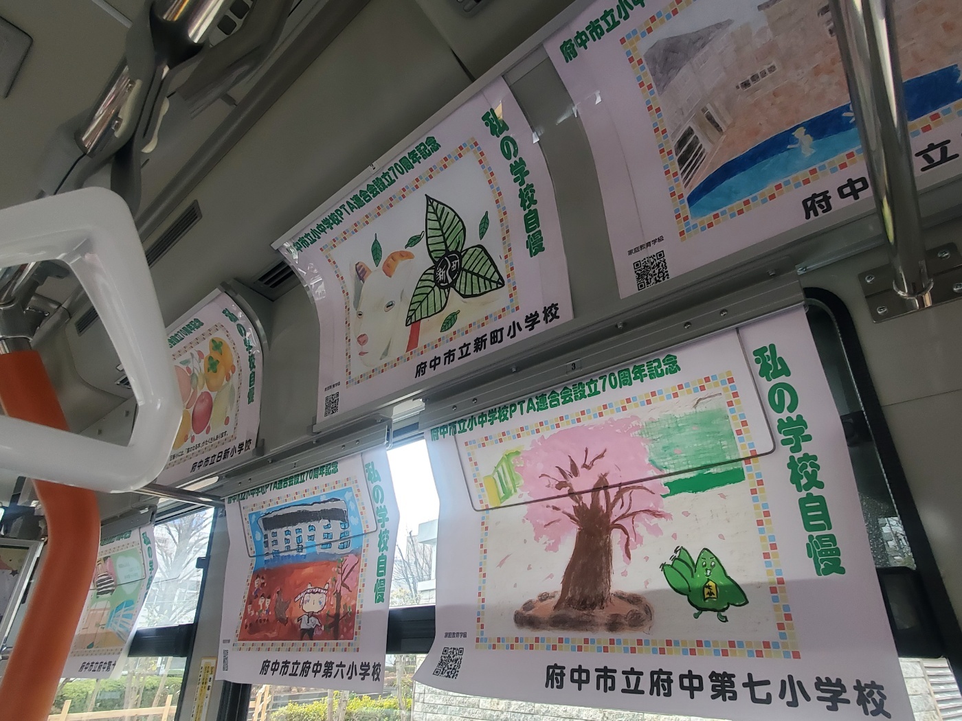 ルミエール府中にてPTA連合会創立70周年式典が開催されました。記念事業の一環として市内小中学校全校で「私の学校自慢」を絵や写真で作品にしました。作品は、ステッカーが貼られているちゅうバスに掲示しています。ラッピングバスは3台あり、3分の1の確率で本校の作品が飾られています。約1ケ月掲示するとのことですので、ちゅうバスに乗られる際は、楽しみにしてください。