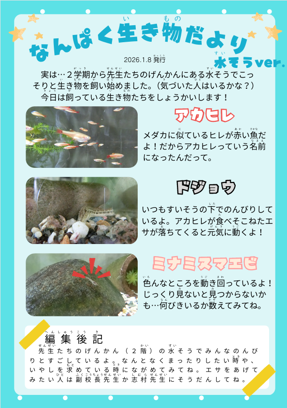 南白小の子供たちは、生き物が大好きです。虫がたくさんいる時期には、休み時間に校庭でダンゴ虫やバッタを探している姿がよく見られます。学校には、虫以外にもたくさんの生き物がいます。少しずつ紹介していきますので、お便りを是非ご覧ください。不定期の発行になりますが、お楽しみください。