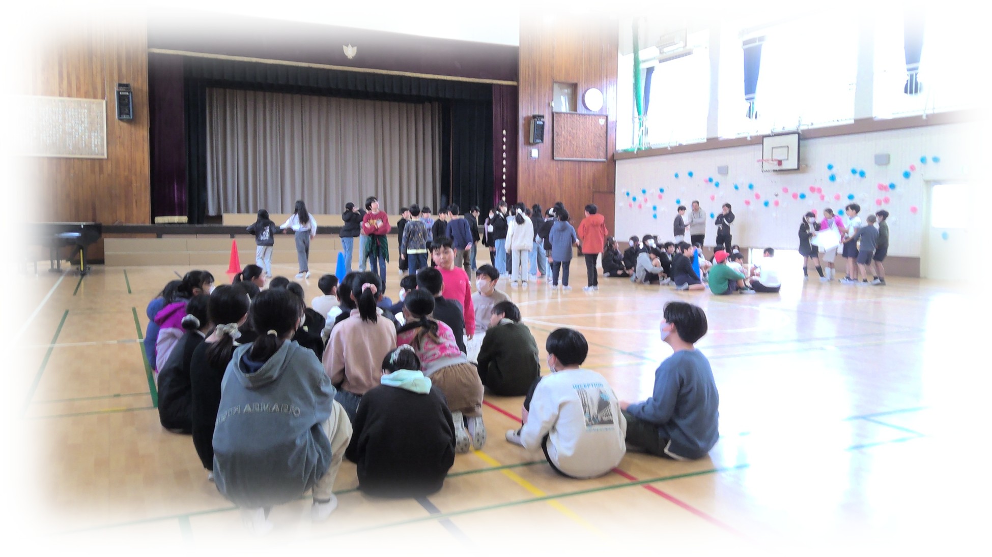 その後は、コートの端にいる仲間へ優しくパスを通すと得点となるゲームを行い、どのチームも大いに盛り上がりました。最後にはコーチから、「声を掛け合うこと、仲間にパスを出すときのように思いやりを大切にすること」と、学校生活にもつながる温かいメッセージをいただきました。