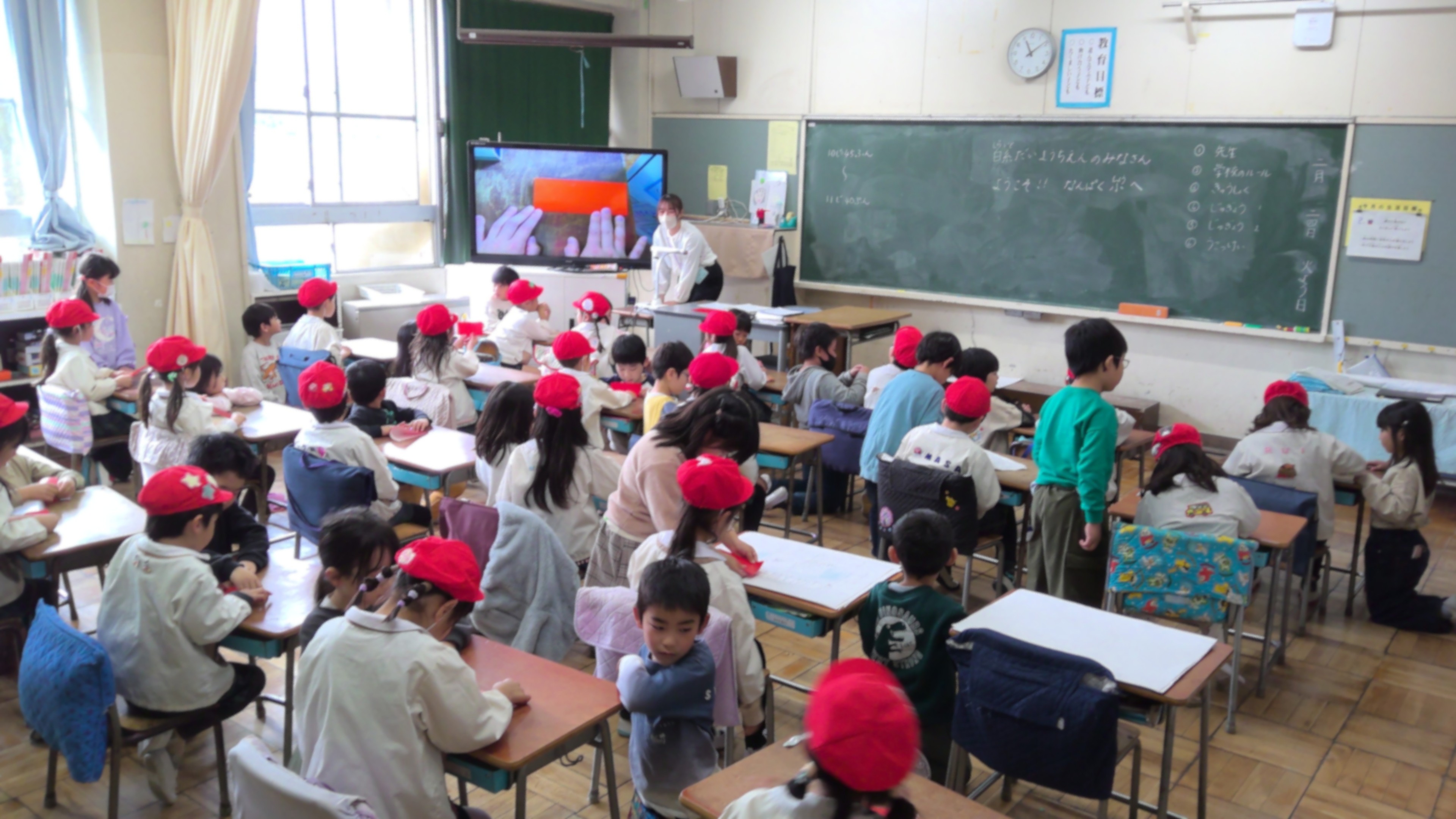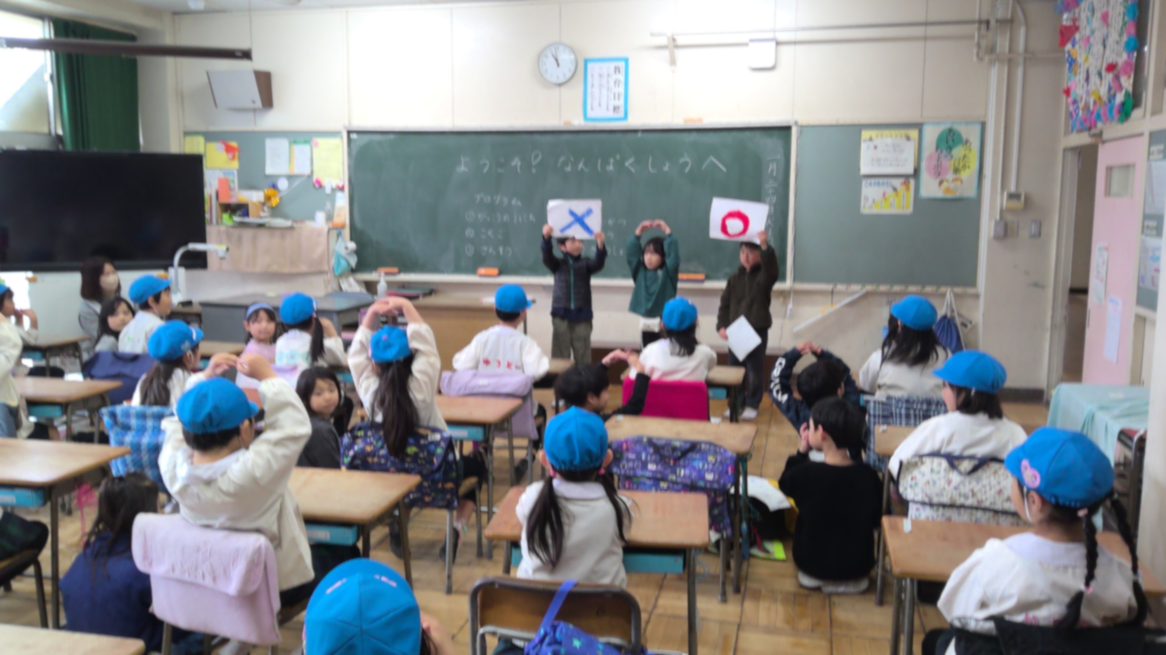 来年度1年生になる年長さんを迎えて、交流会を開きました。「年長さんが小学校に入学するのが楽しみになるようにしよう」をめあてに、自分たちで発表内容を考えました。年長さんに様々なことを教えてあげる1年生はすっかりお兄さんお姉さんらしく、頼もしく感じました。