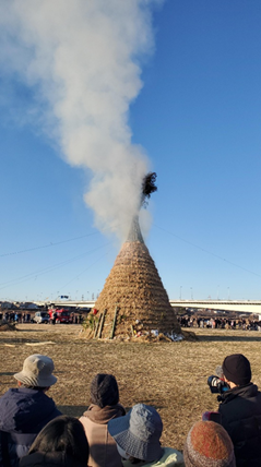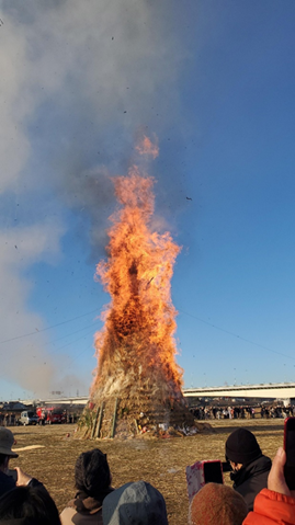 どんど焼きの集いの準備は、10日(土)から始まっているのではないということをご存知ですか。年が明けるとすぐに、長い・太い竹を準備するというところから始まっているそうです。今年は、風が強い日が多く、準備が大変だったそうです。12日(月)は風もなく、無事に点火できました。今年も皆さんが健康で幸せに過ごせますように。