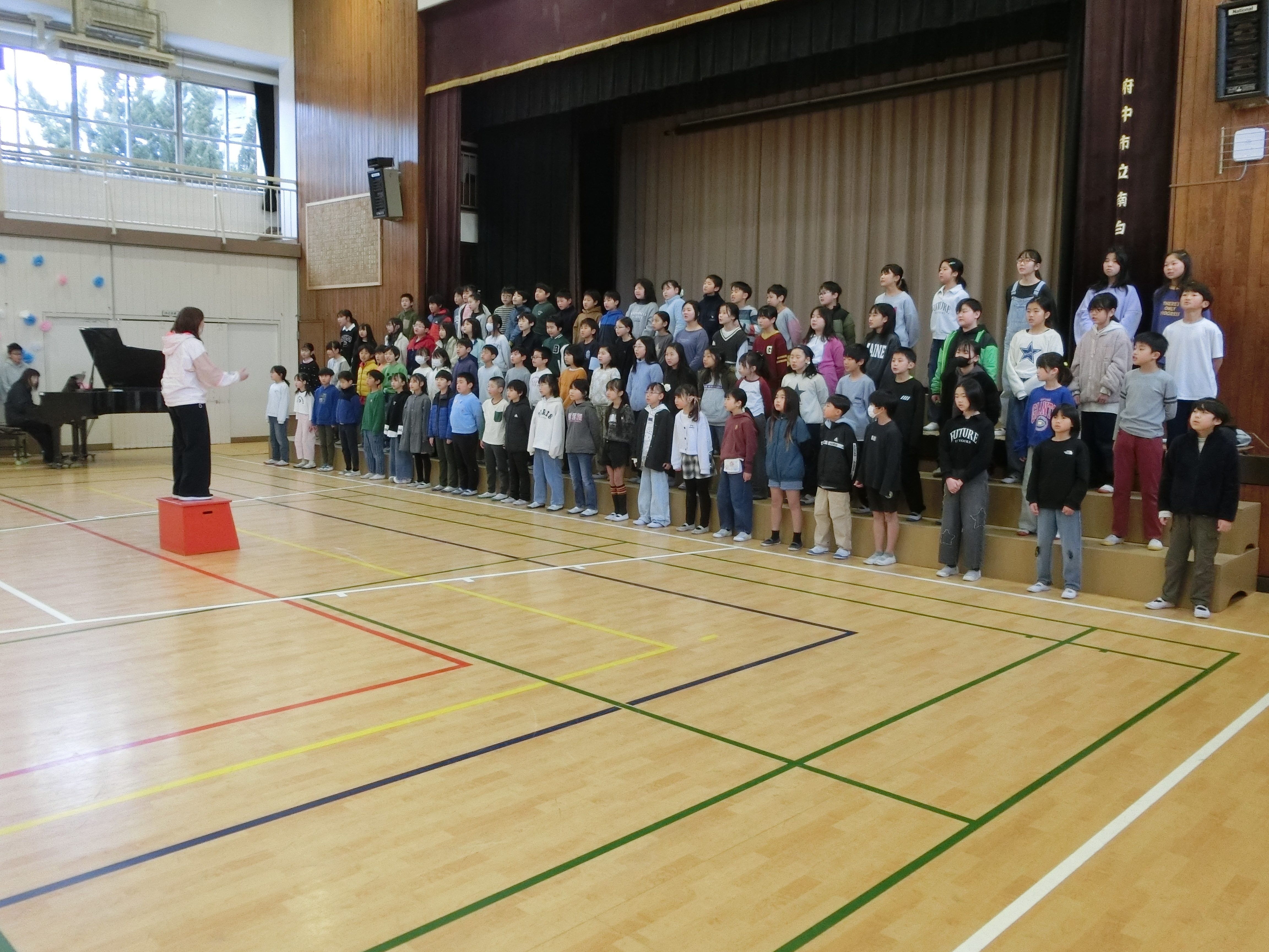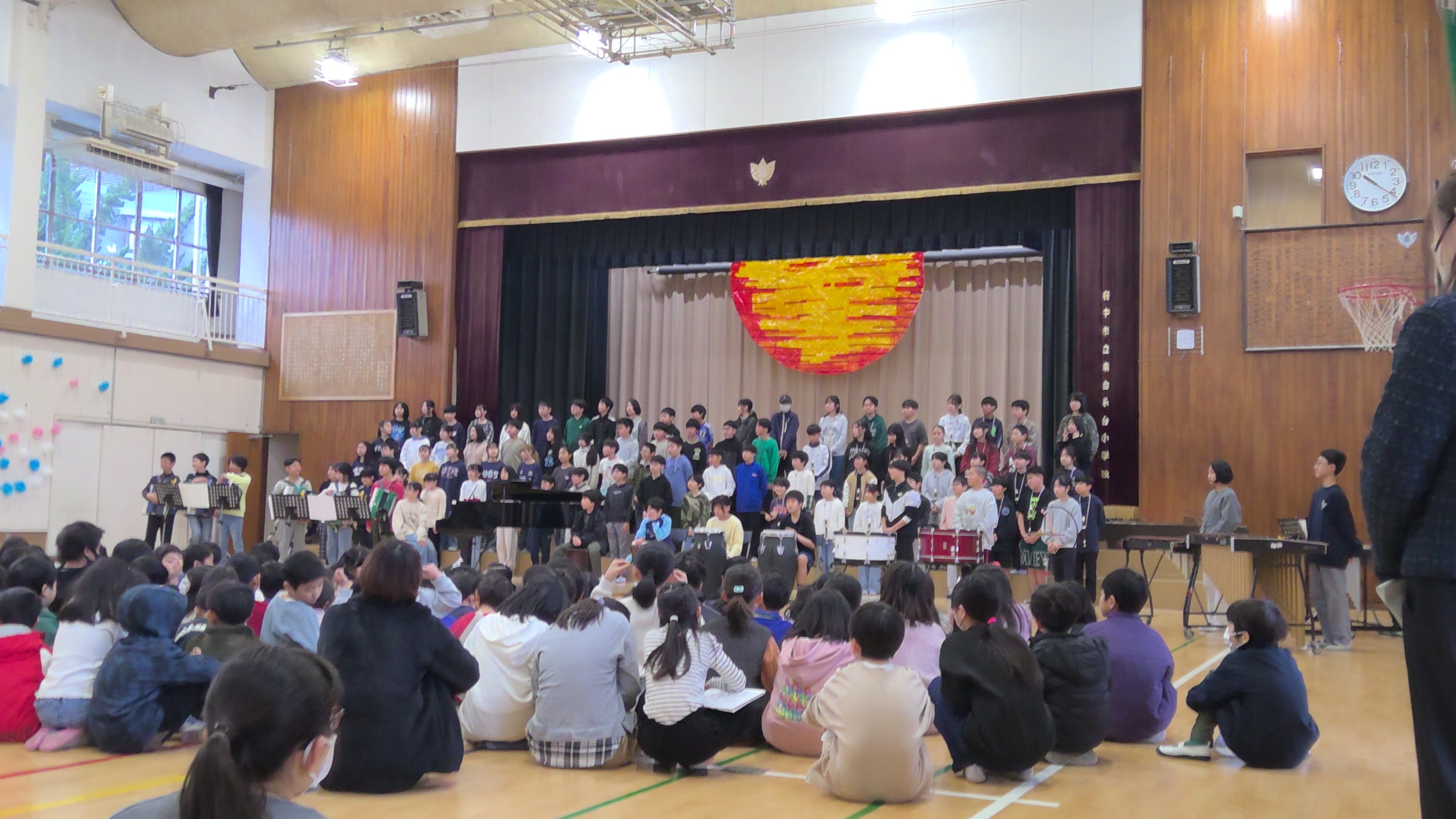 今朝の児童集会で「ディズニーメドレー」を発表しました。気温が低く、朝早い時間の発表でしたが、頑張って発表しました。以前発表したことのある曲だったことや舞台に立つ経験に慣れてきたこともあり、自信をもって発表することができました。次の発表の機会は、3月7日(土)の卒団コンサートです。コンサートに向けてさらに練習を重ねていきます。皆様、是非、卒団コンサートを楽しみにしてください。