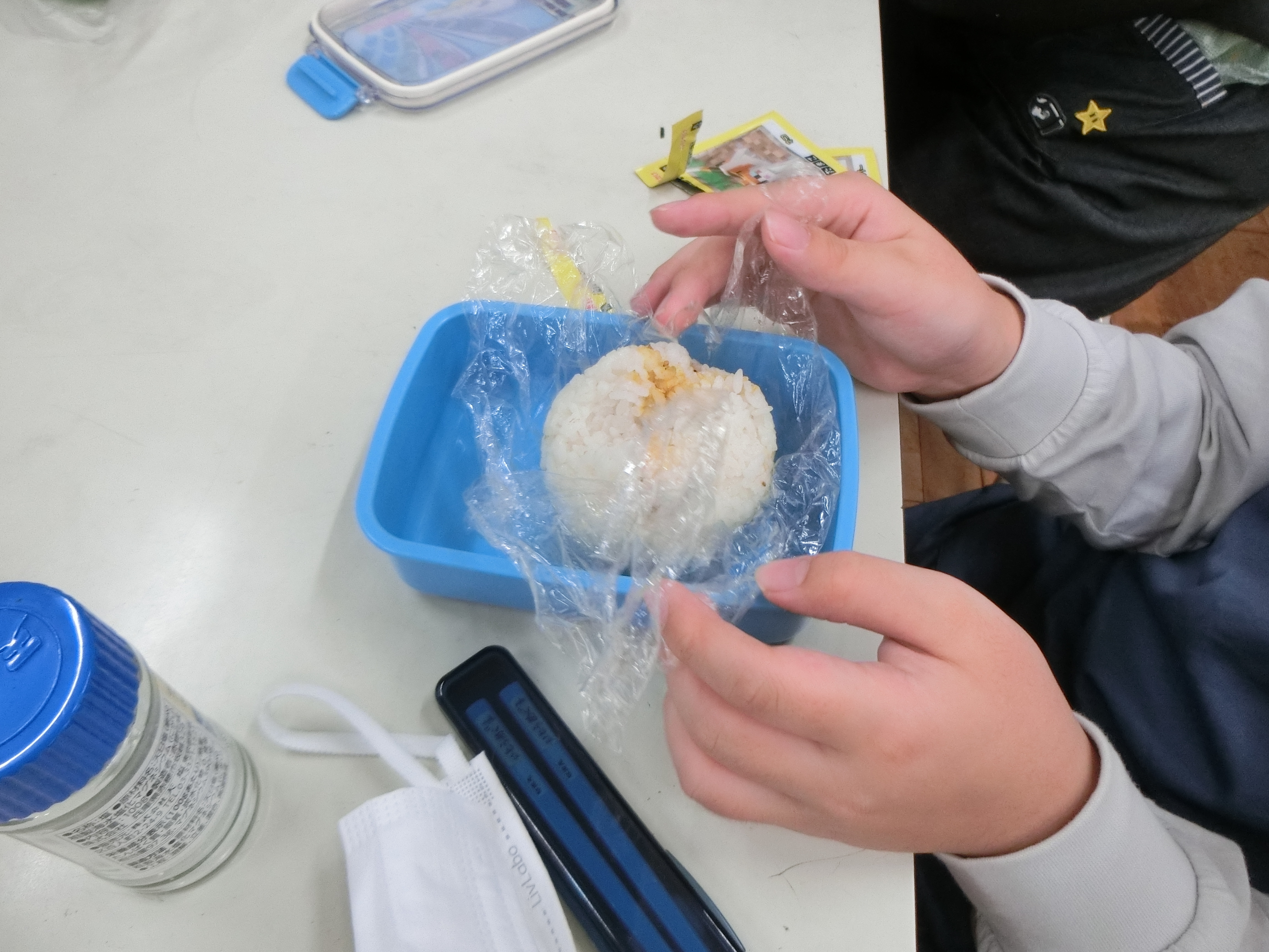 4時間目に5年4組が先行しておにぎりパーティを行いました。自分たちの手で育ててきた米を先日脱穀し、講師の先生方のお力を借り精米の過程を終え白米になり、本日食べることができました。