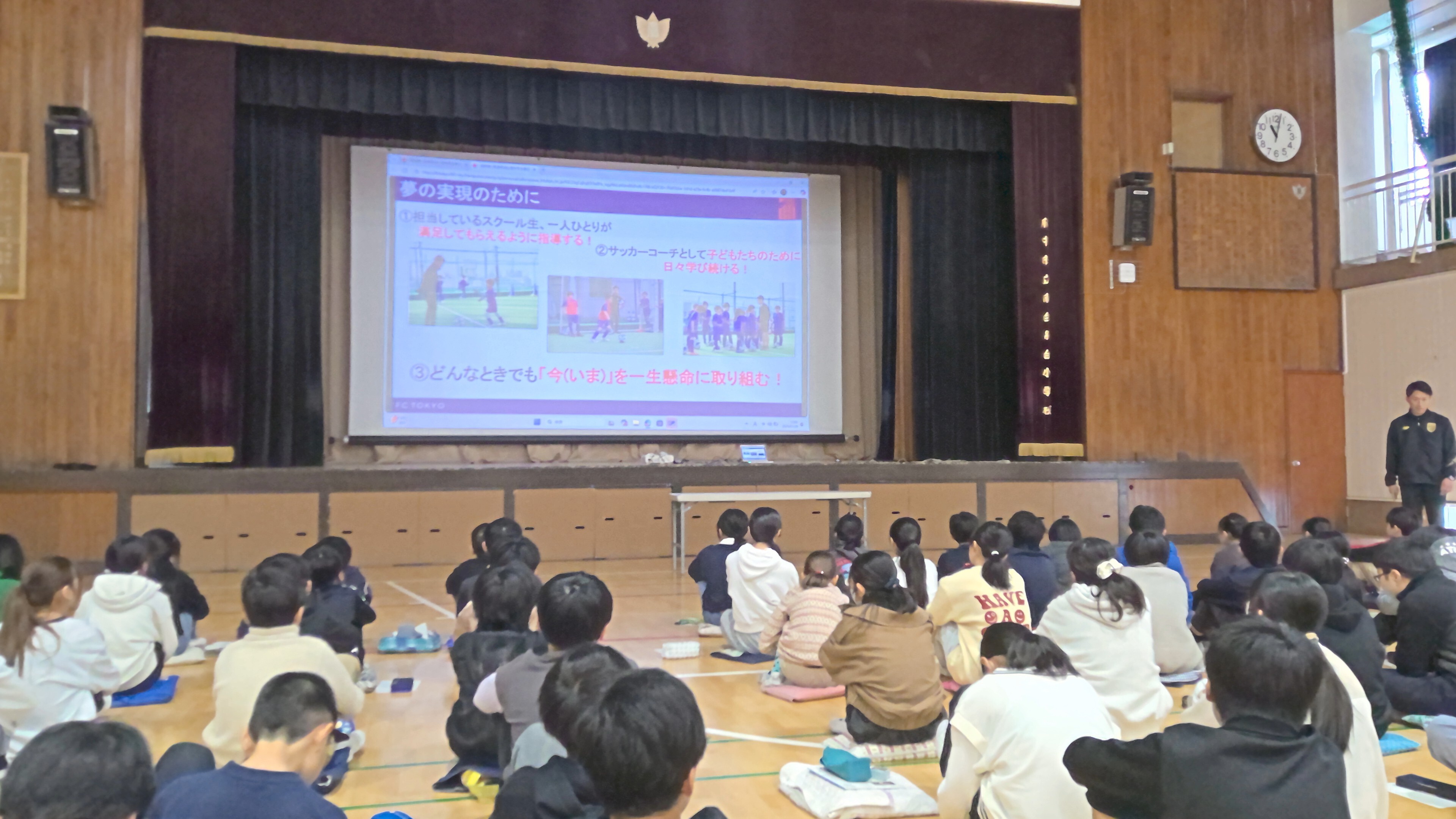総合の時間のキャリア教育の一環として、FC東京のコーチの方をお招きし、ご自身のキャリアについてお話しいただきました。小学生の頃に思い描いていた夢と現在の仕事は違っていても、どこで方向転換をしたのか、また、うまく進路の方向性を変えるためにどのような意識や姿勢が必要なのか、たいへん具体的に語ってくださいました。
