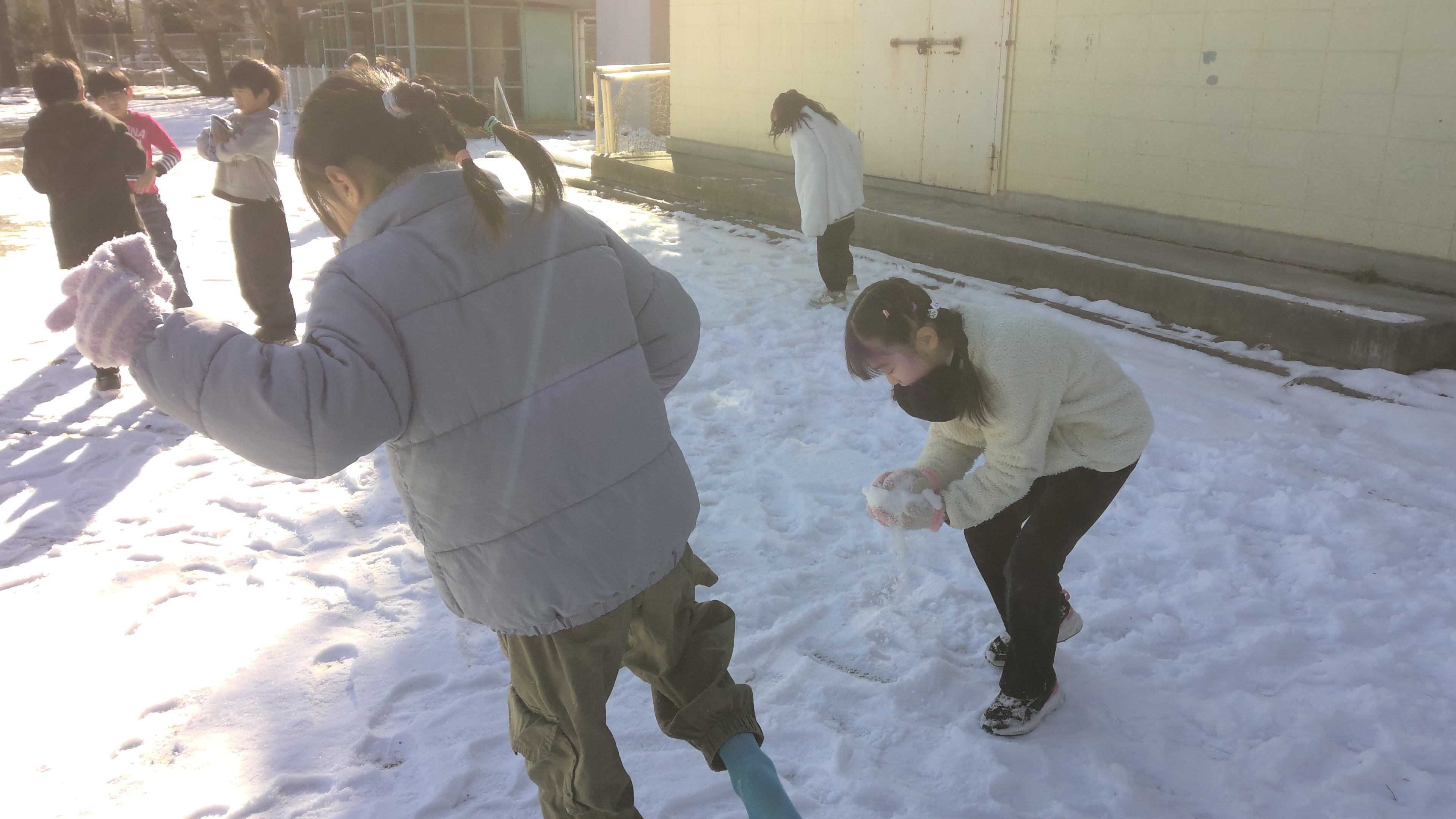 週末に降った雪がまだ校庭に残っていたため、雪遊びをしました。小さい雪だるまを作ったり、つららを探したりしました。寒い中でも2年生の児童は、元気いっぱいに遊んでいました。