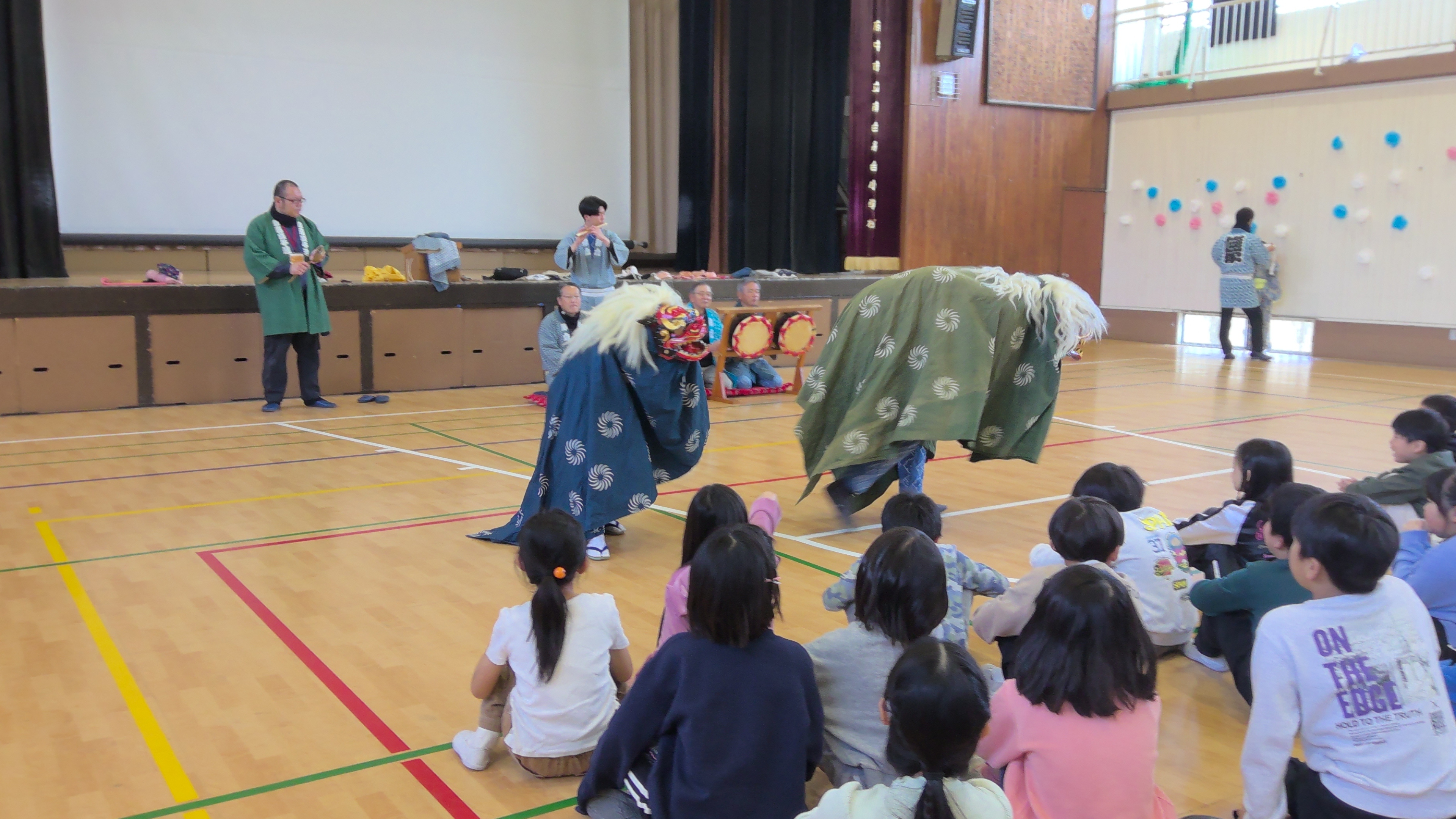 押立囃子連と車返囃子連の方をお招きして、お囃子体験の学習を行いました。くらやみ祭などで行っているお囃子を間近で見させていただき、貴重な経験になりました。お囃子連に参加している3名の児童も一緒に踊り、普段は見られない姿に子供たちも大興奮でした。