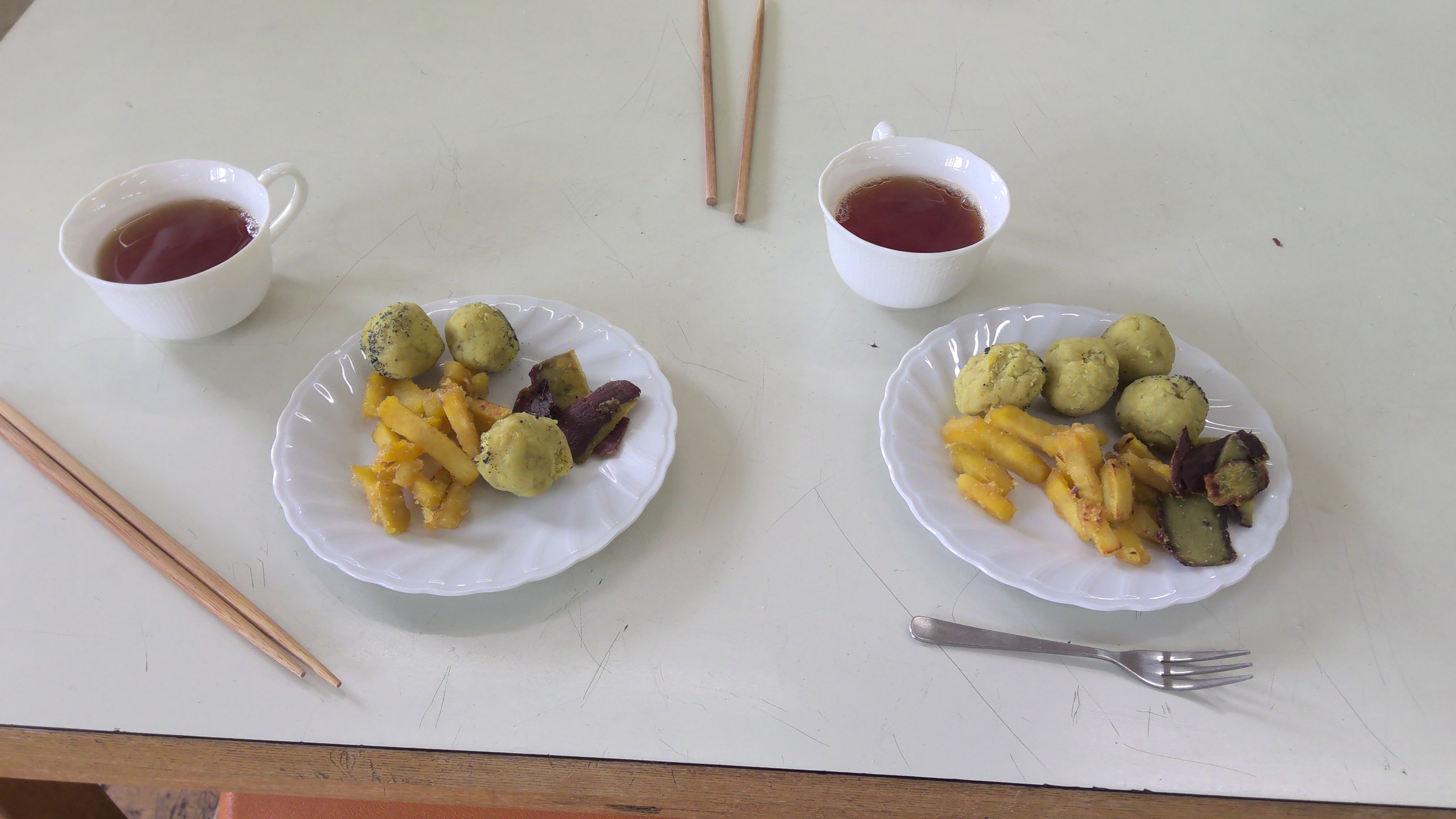 最後の家庭科の時間には、各クラスで調理実習を行いました。サツマイモを使って、皮チップス・大学いも・いも団子の3品を作りました。どのグループも協力しながら、見た目も鮮やかで美味しい料理に仕上げることができました。